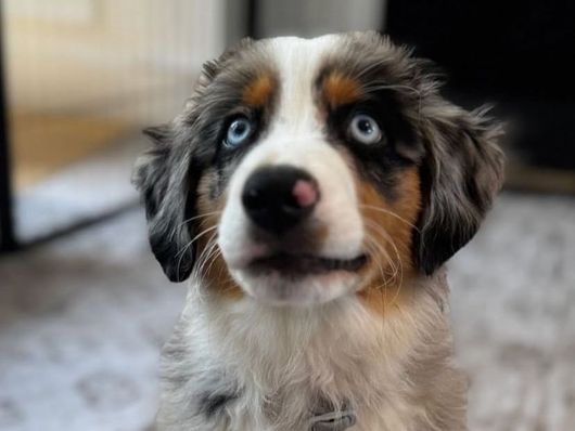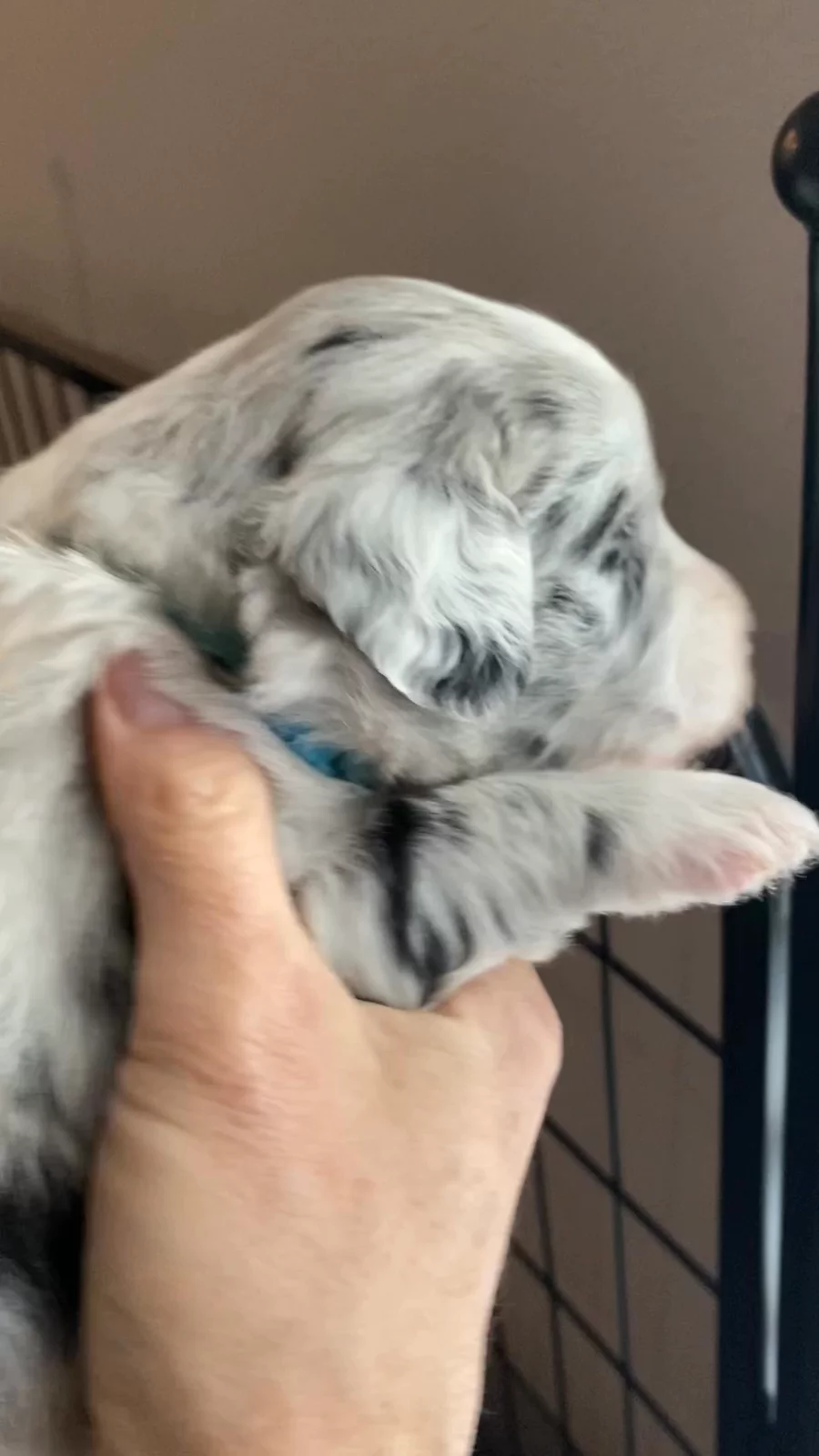 Bruce is a blue merle toy Australian Shepherd with one blue eye and one blue and brown swirl eye. He is estimated to be about 12 pounds full-grown. Bruce loves to play and snuggle.