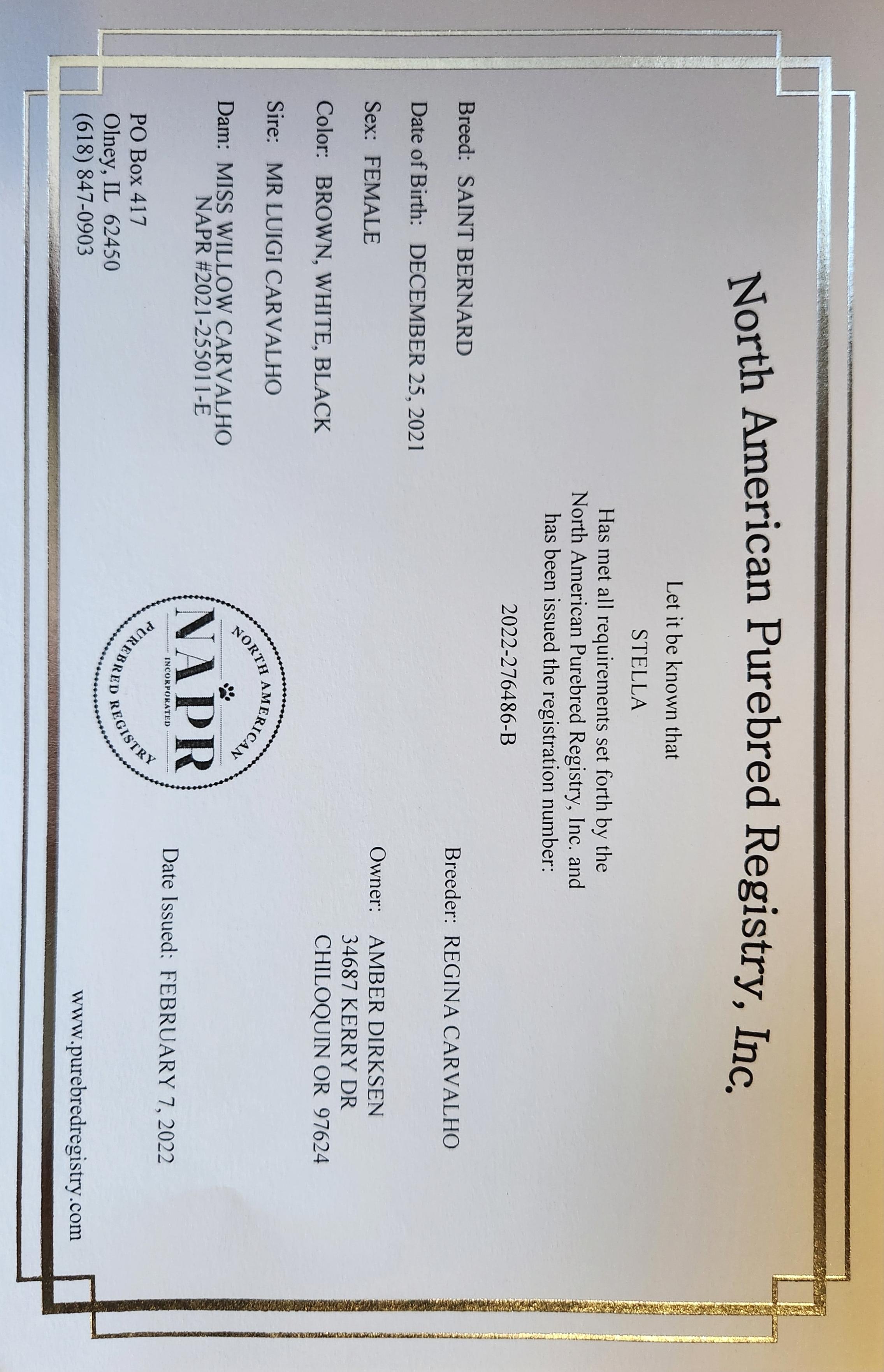 Amber's Saint Bernards meets or exceeds our community standards in these areas: