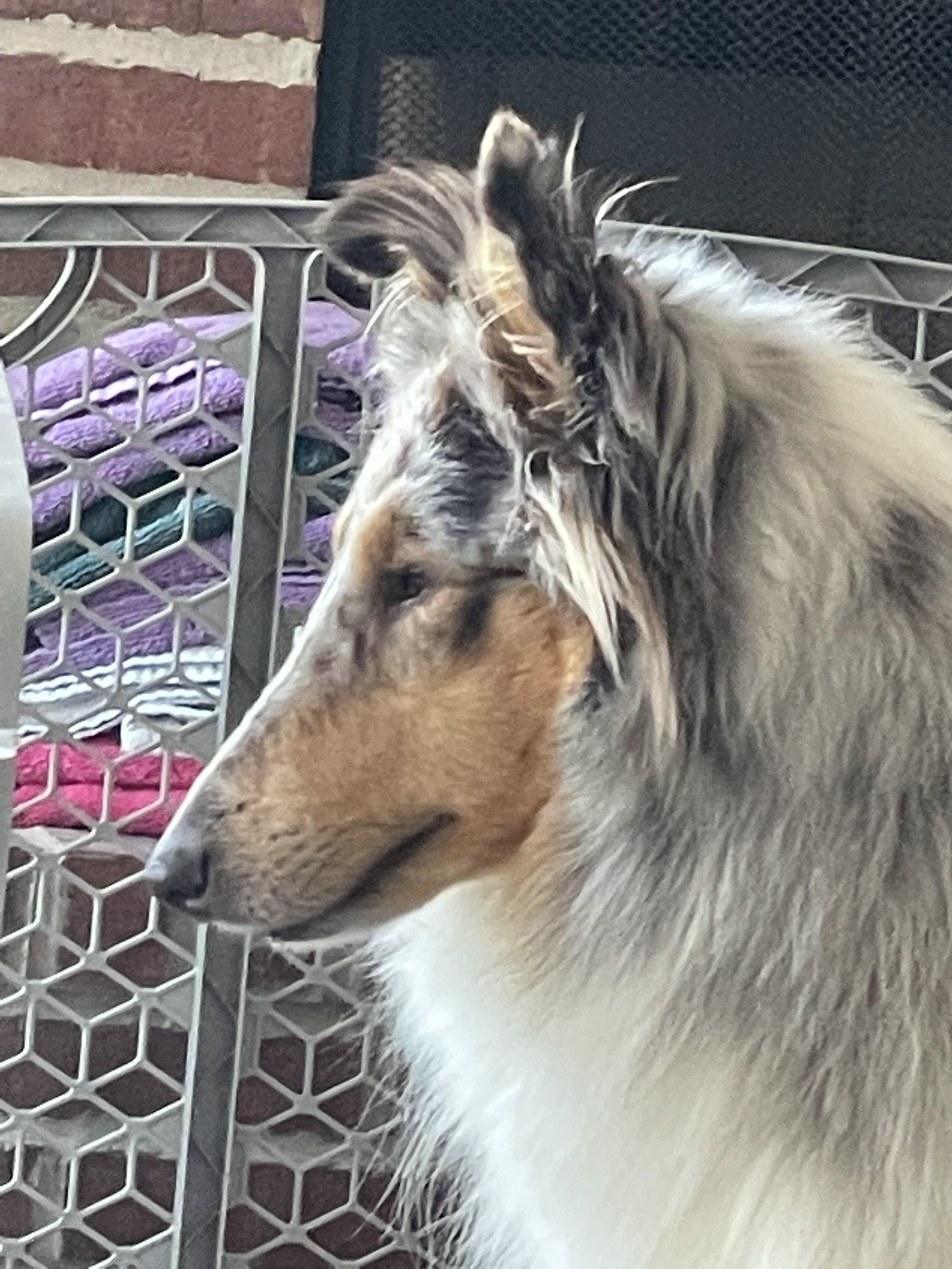 Rylee is a beautiful blue merle. She’s a sweet girl who loves keeping an eye on the goats and ducks.