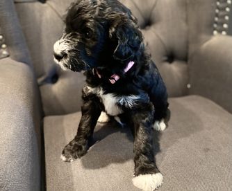 Very smart and willing girl. She has very soft wavy hair. She is a sweetheart that loves her people. She is a good mother too. She has had one litter of 8 stunning pups. All placed in homes.