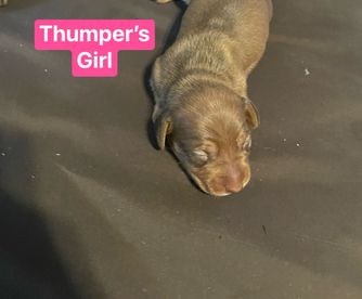 Thumper is a female Dachshund. Carefully selected as a great representative of her breed, Amy decided to make her part of their program. Amy has passed Good Dog’s screening process, which involved a review of their breeding practices, environment, and the mental and physical health of their dogs.