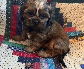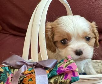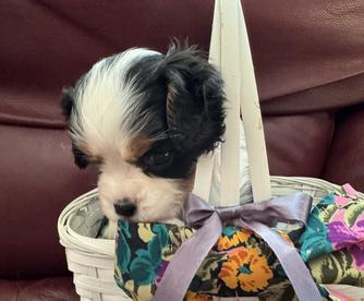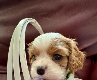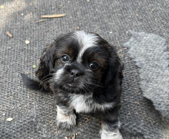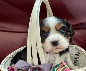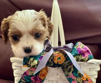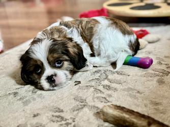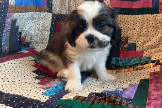 Our Cavatzu puppies include brindle and white, brindle, black and white, blenheim, and gold and white. Cavalier King Charles Spaniel puppies include blenheim and tri-color. Colors will vary depending on the parent dogs.