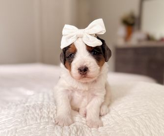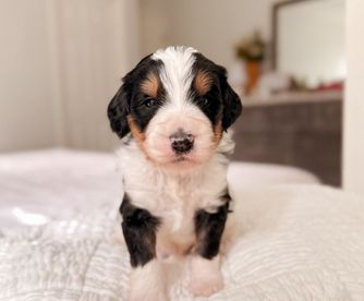 Our Bernedoodle puppies include black, black and white, tri-color, and blue merle. Goldendoodle puppies include cream, apricot, and red. Colors will vary depending on the parent dogs.