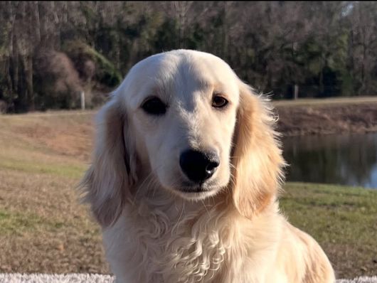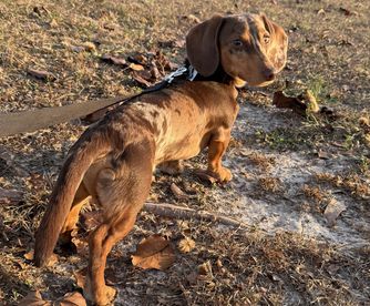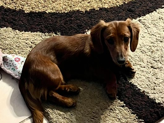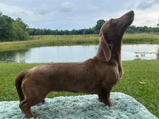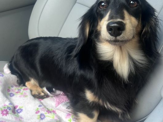 Vera has the sweetest calm nature, she rarely barks ( kinda rare for a dachshund !) and loves to sit in your lap or go for rides . She is 10 lbs , akc registered and health tested .