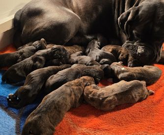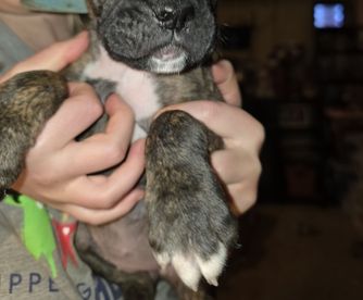 Our puppies include fawn and brindle. Colors will vary depending on the parent dogs.