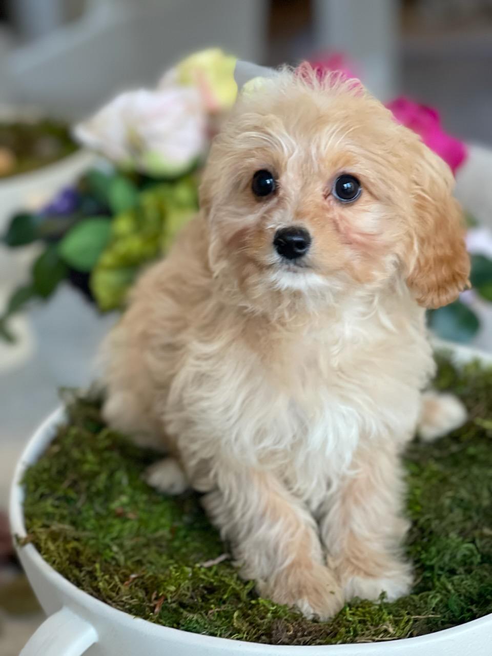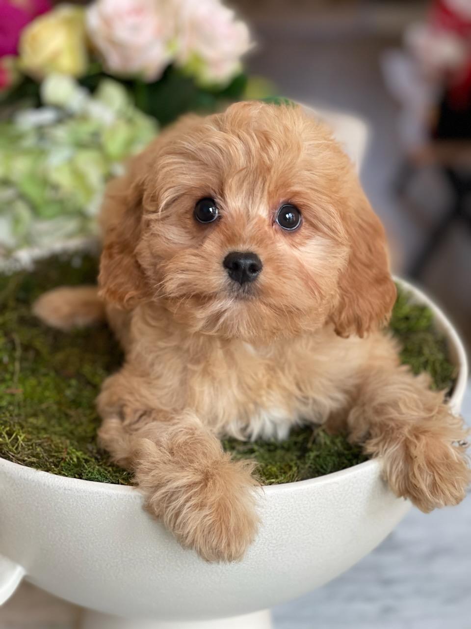 Goldendoodle puppies include cream, red, and chocolate. Poodle puppies include sable, cafe au lait, and parti. Cavalier King Charles Spaniel puppies include blenheim and tri-color. Colors will vary depending on the parent dogs.