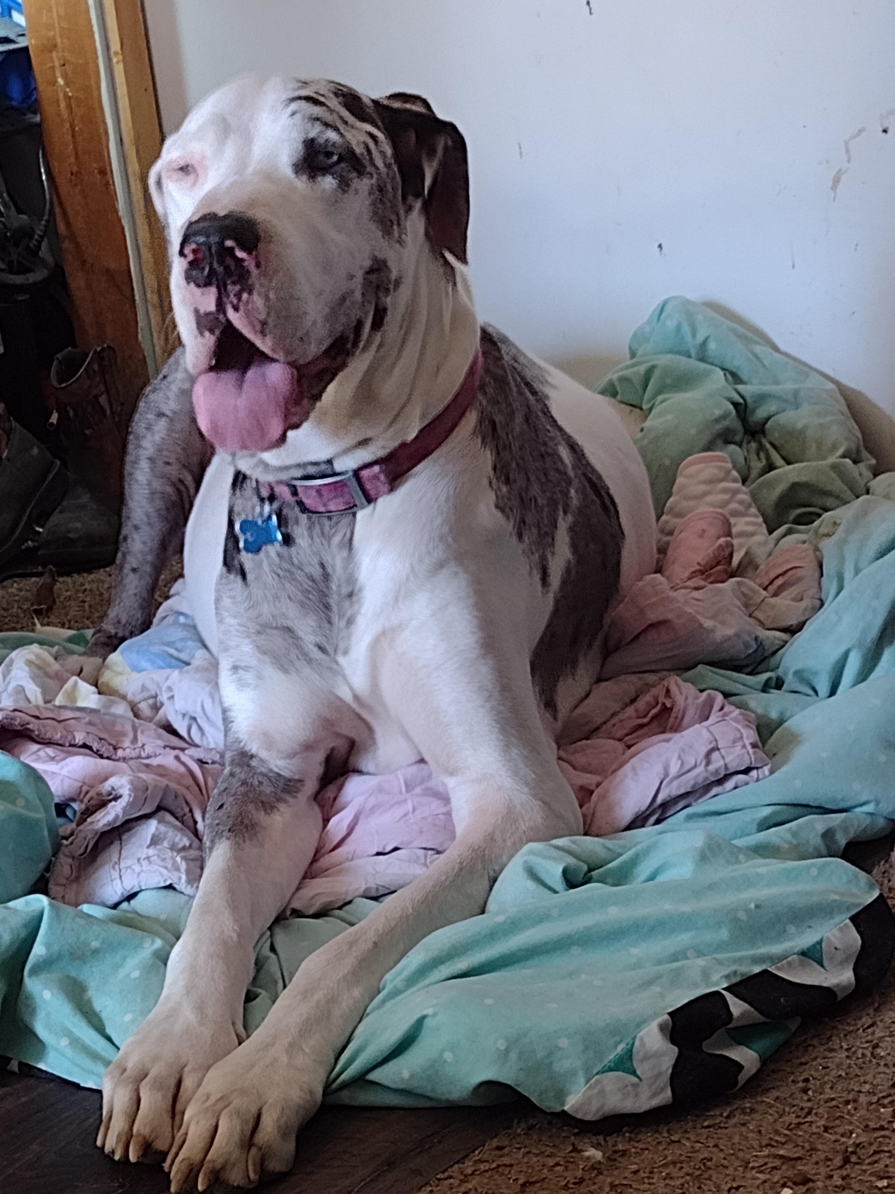Negan is our 50/50 blue merle Daniff stud, hes 2 yrs old and around 185lbs. hes the son of Axl and Sky.