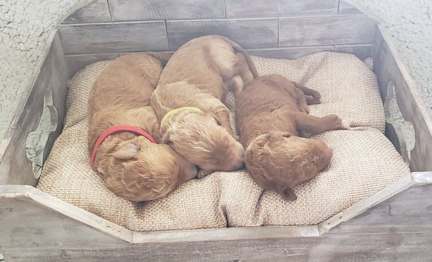 Our Goldendoodle puppies include cream, apricot, red, chocolate, black, and merle. French Bulldog puppies are black and tan. Colors will vary depending on the parent dogs.