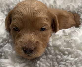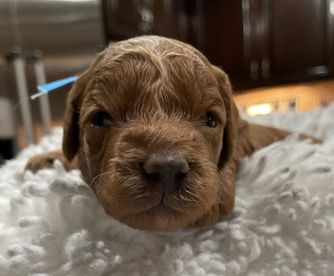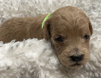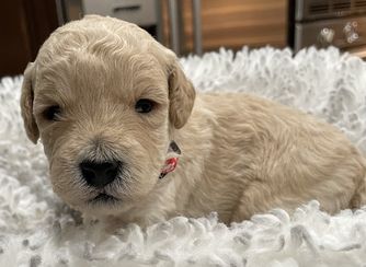 Our Goldendoodle puppies include cream, apricot, red, and parti. Colors will vary depending on the parent dogs.