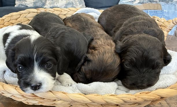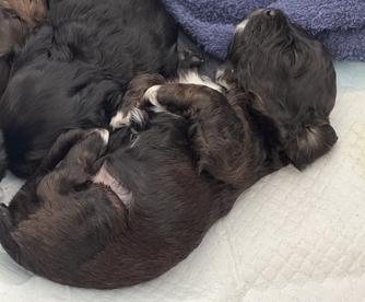 Our puppies include brown roan, black and white, and black. Colors will vary depending on the parent dogs.