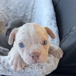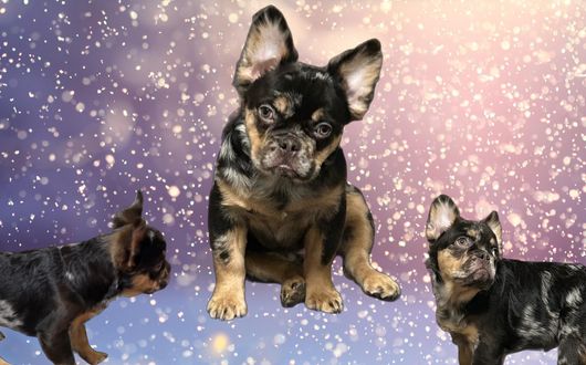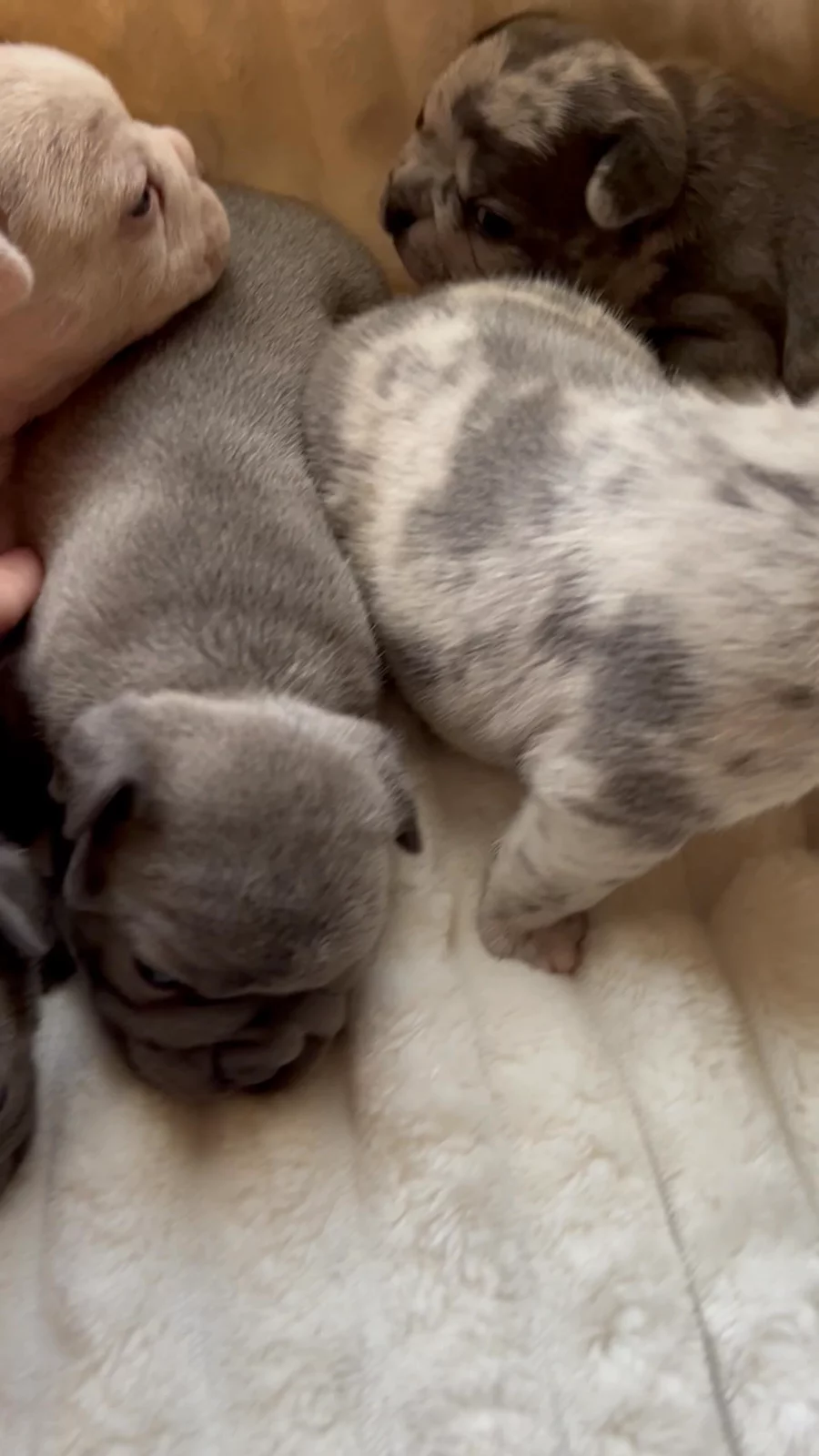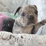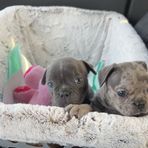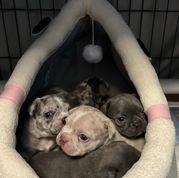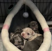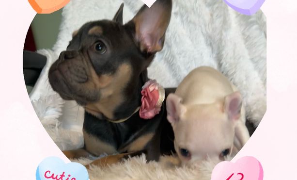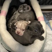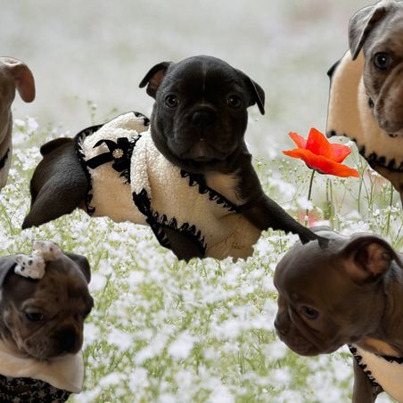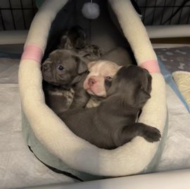 Our Boston Terrier puppies are seal brindle and white. French Bulldog puppies include cream, blue, and tricolors. Colors will vary depending on the parent dogs.