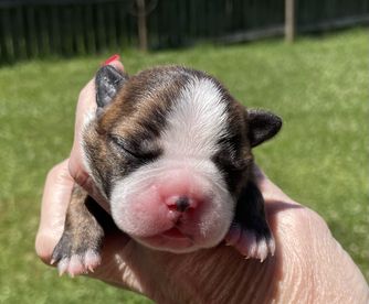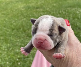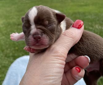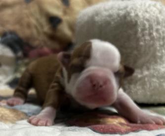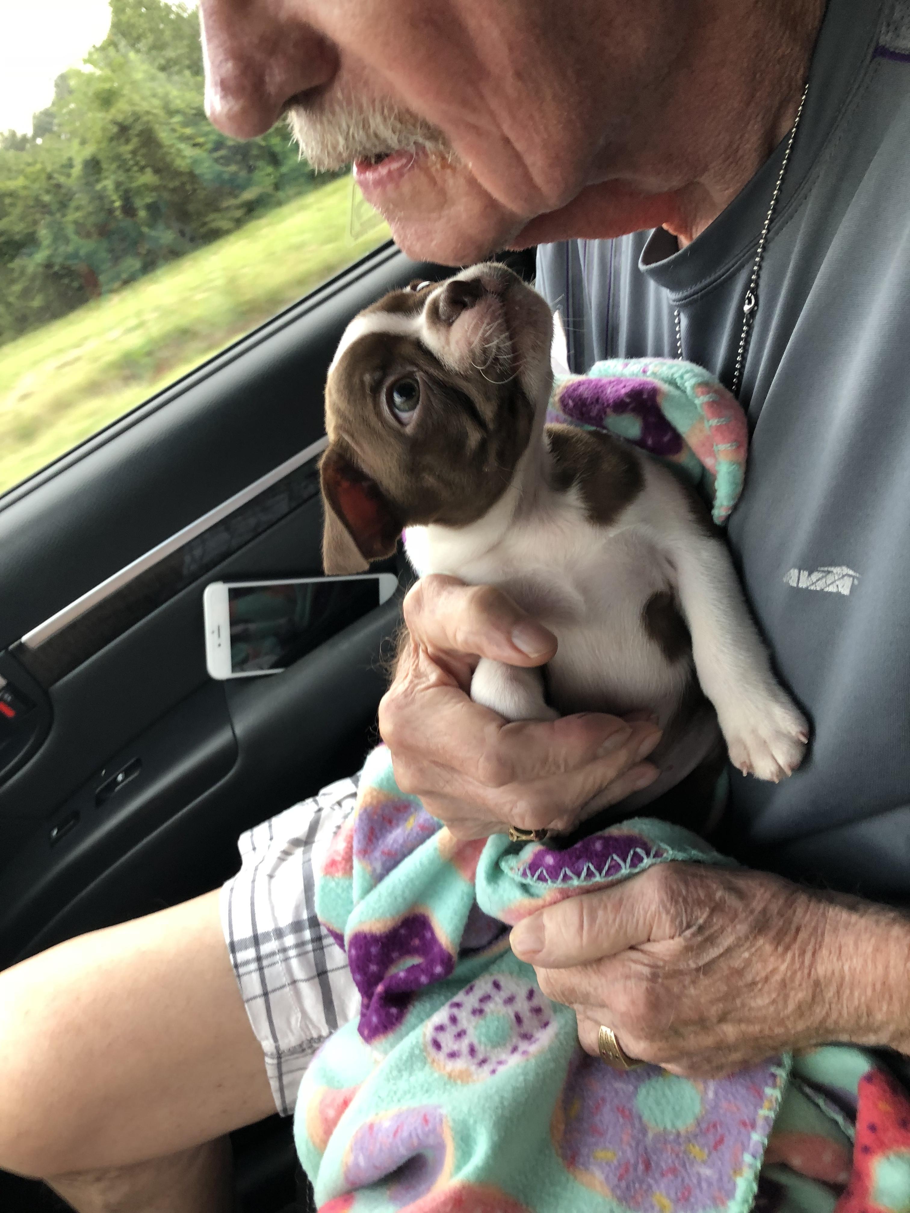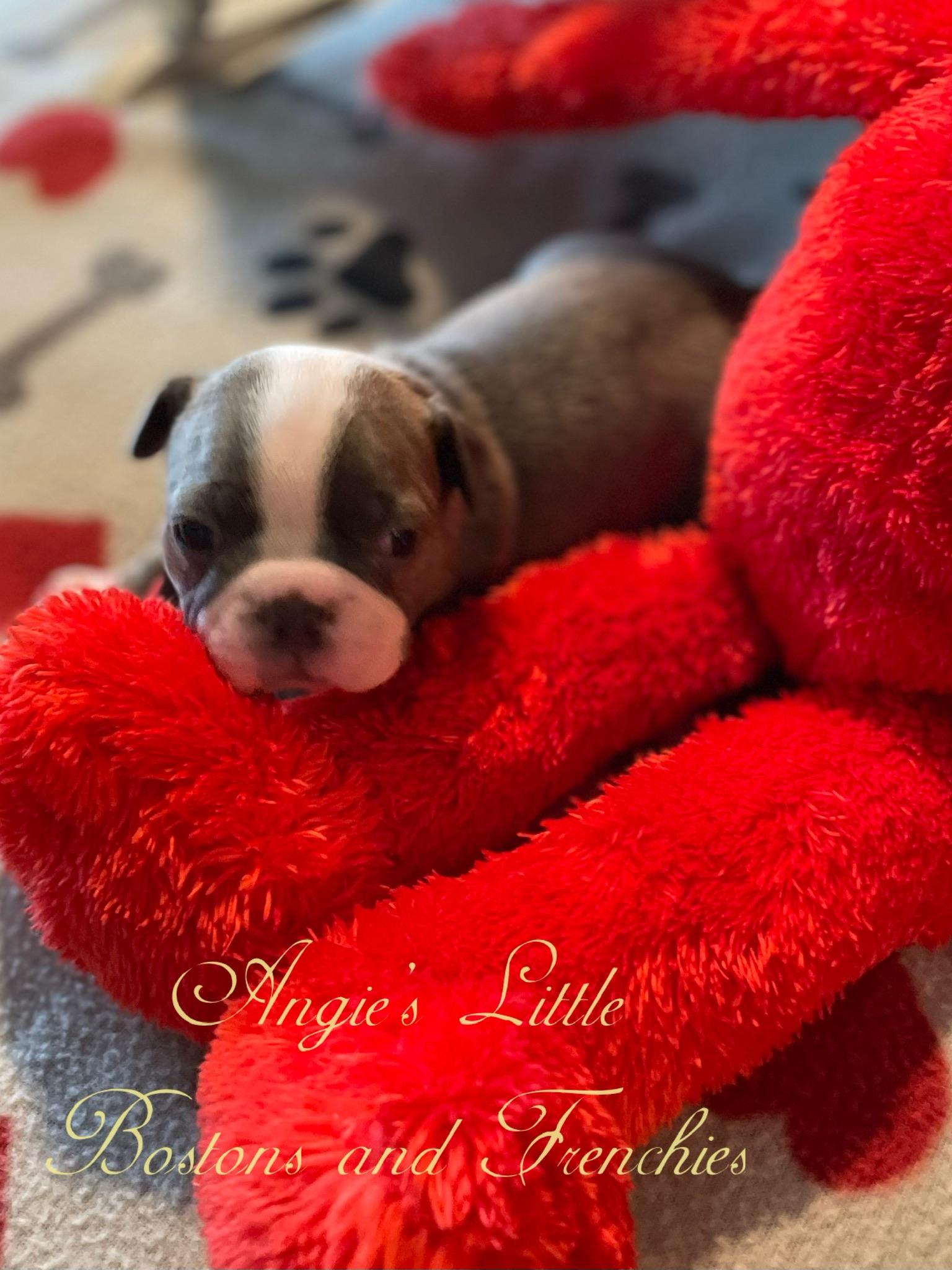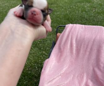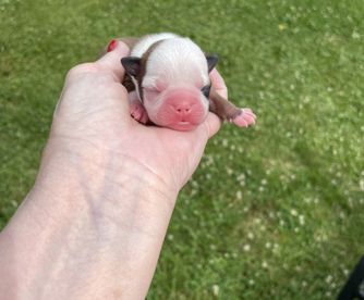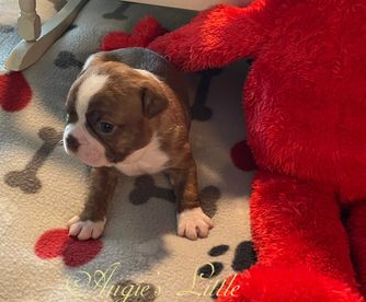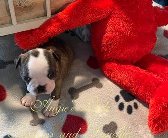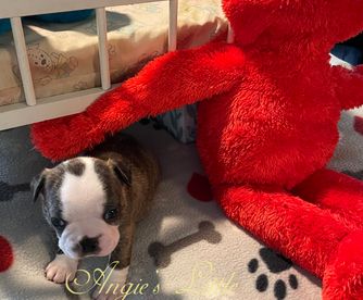 Angie loves the puppies that she breeds and makes sure that the potential owners are the right match. Angie was accommodating and met us halfway to drop off our little girl. We named her Pipsqueak because she’s so tiny, has a sweet yet spunky disposition and gets on well with our other Boston Terrier. Pipsqueak is a great addition to our family. We highly recommend getting your puppies through Angie!