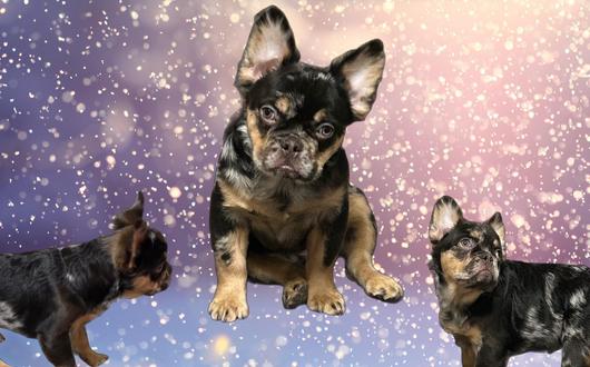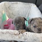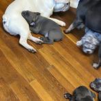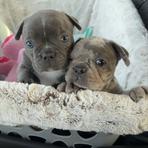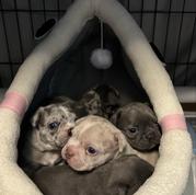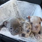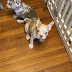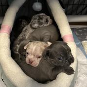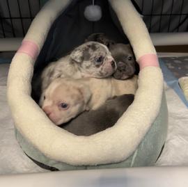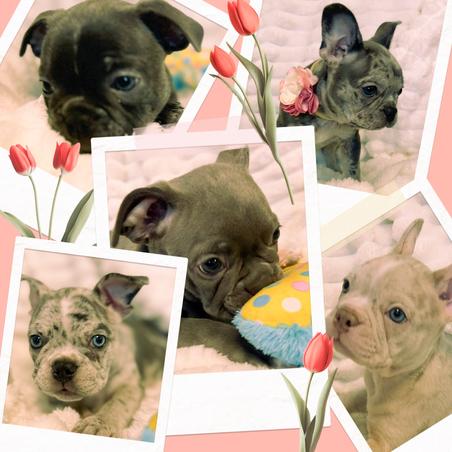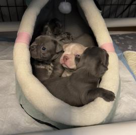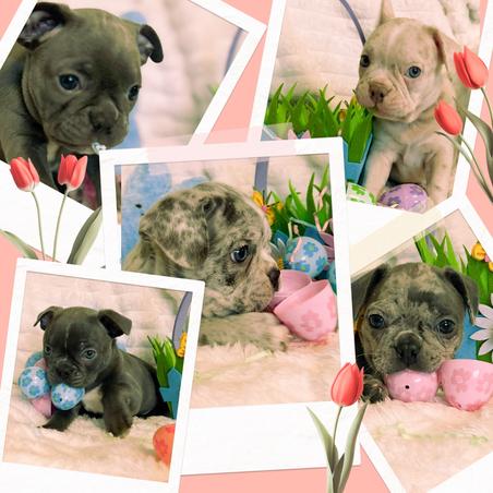 French Bulldog puppies include cream, blue, and tricolors. Boston Terrier puppies are seal brindle and white. Colors will vary depending on the parent dogs.