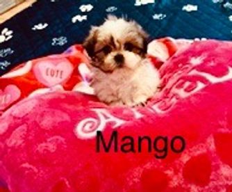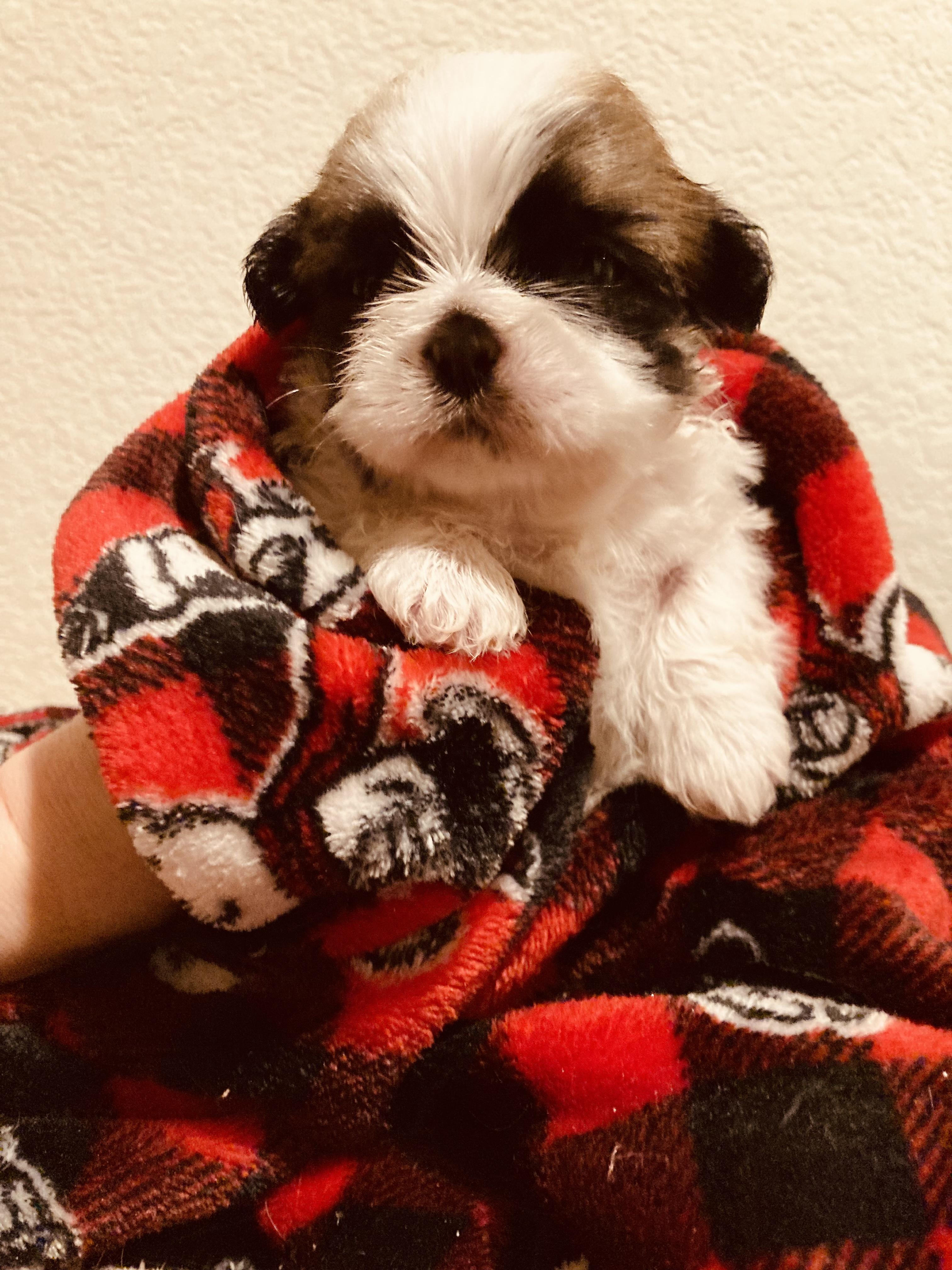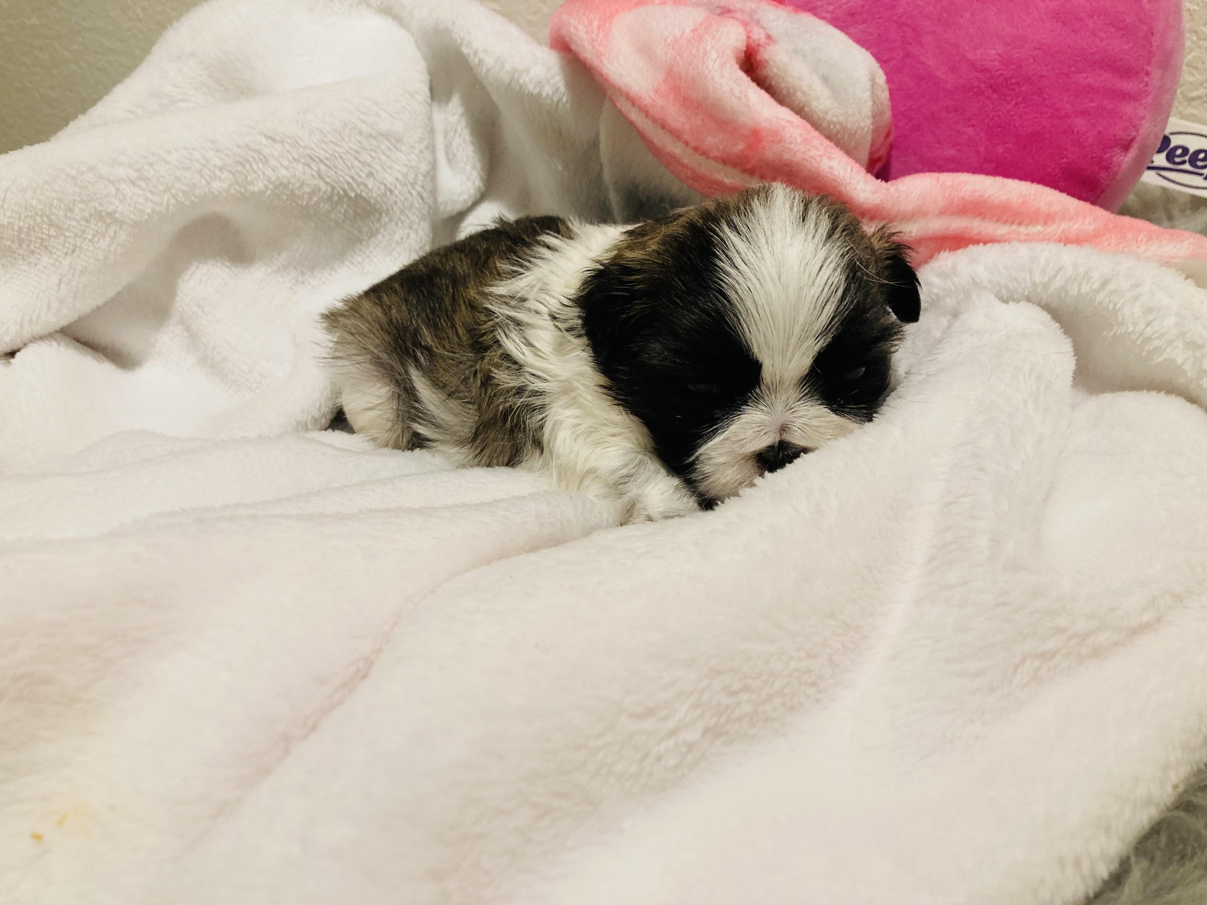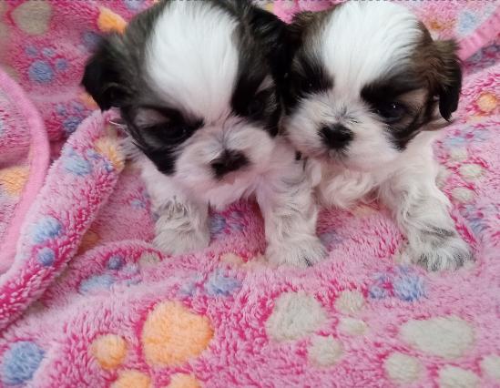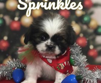 Our Shichon puppies include black and white and brown and white. Shih Tzu puppies include liver and white, black and white, and brindle. Colors will vary depending on the parent dogs.