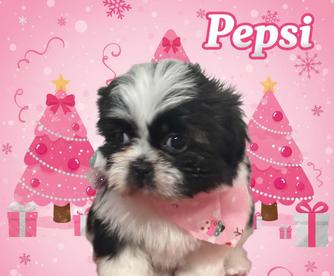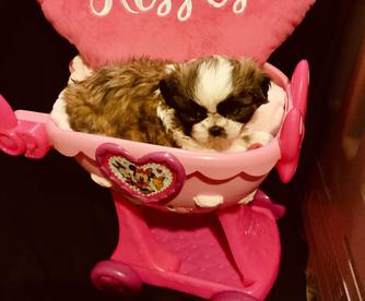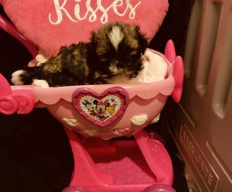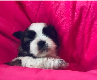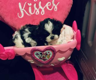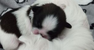 Angel is a pure shih tzu. She is primarily a very calm dog, and enjoys being around people. She also loves being outside, but is pad trained and normally stays inside during the colder months. She has always been low maintenance and is a very fast learner. She seems to love being a mother to her litter, and takes exceptional great care of her babies. She is black and white. Her litter consists of 4 black and white and 1 brown and white female puppy. She weighs about 10 lbs.
