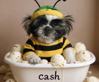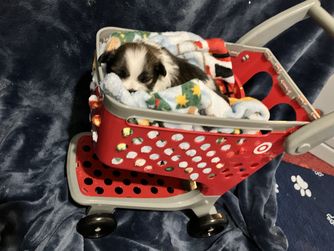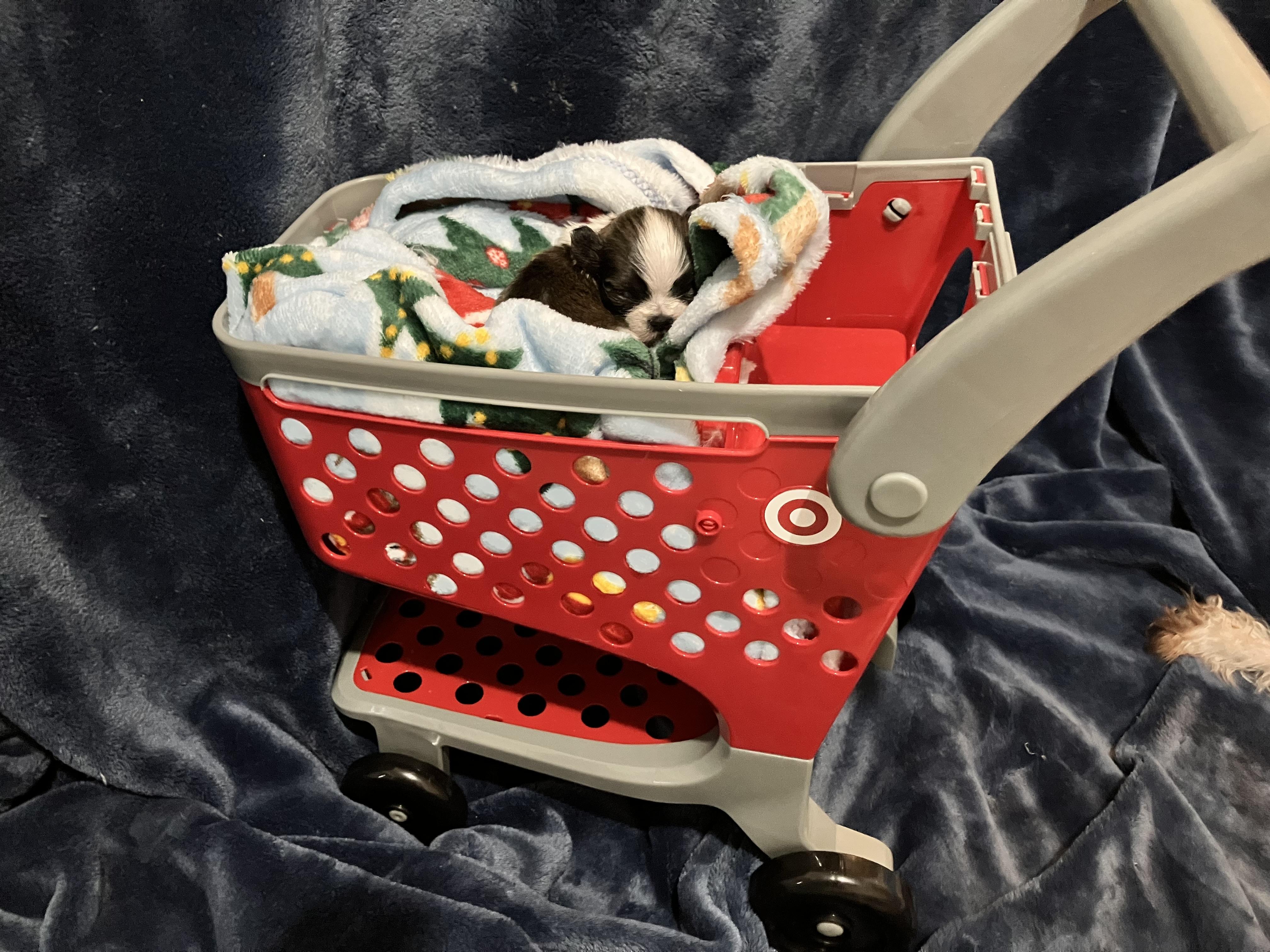 Buttercup is a very sweet, sensitive dog with very mild manners. She is a great mother to her puppies. Buttercup’s mom is a Zuchon. (Shi tzu/Bichon) and her dad is a pure Shih tzu. Both parents are both black and white also. Buttercup has more of the shih tux characteristics than the bichon referring to her facial characteristics.