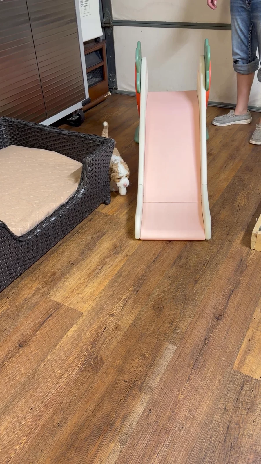 Gracie is gentle natured and just so sweet! She’s our future Mini Goldendoodle Mama! She carries Brown, Phantom and Parti! She’s been Health cleared and DNA Tested through Embark! We plan to get her OFA’s next Spring! We Love Her Personality! We plan to breed her with Bishop! Their puppies will weigh 25-45 pounds.