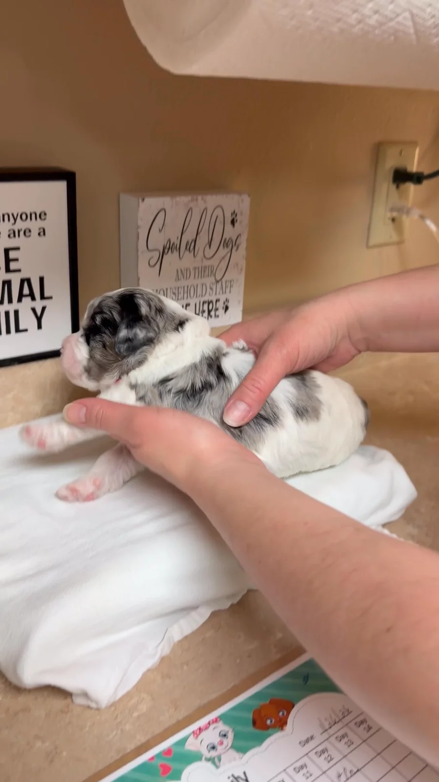 All the puppies are now like Miss Jewel with the ENS-we do this each until they’re 16 days old. Today they’re 2 weeks old!