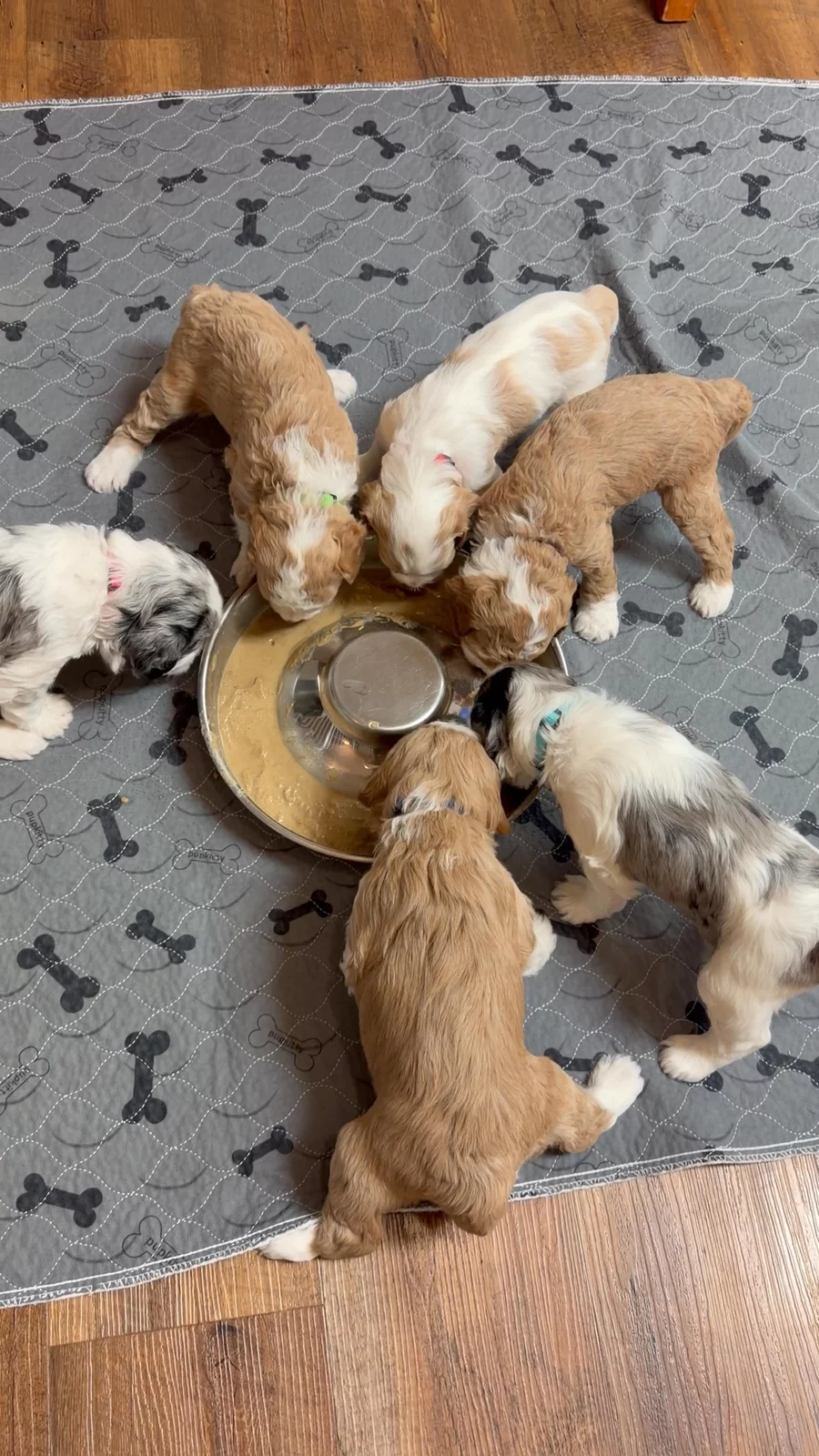 Puppies loving their mush in their extended Pen! Big changes they now have a sleep area and play area! They will be 4 weeks tomorrow!