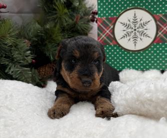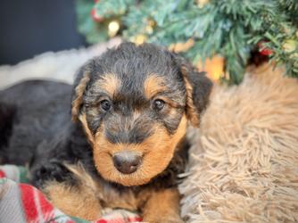 Rosie is a wonderful Airedale with a rich, vibrant coat, displaying the classic black saddle and tan accents. Beyond her stunning appearance, she has a gentle and playful nature, making her fantastic with kids. Her past puppies have inherited not only her beautiful coloring but also her sweet temperament, making them as loving as they are striking.
