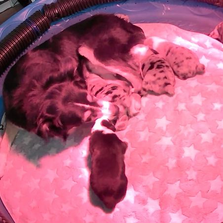 Growing up we always had border collie's but I loved the look of the blue merle Australian Shepherd but knew nothing of their wonderful, amazing, devoted personalities. When my husband and I got our first Aussie we were amazed by their intelligence, loyalty, and devotion to their family. It was soon after that we decided we wanted a male aussie to breed to our blue merle female. I began researching breeding and breeders and looking for a perfect match for our girl, Annie, thinking we would have one litter. Well....I literally fell IN LOVE with whelping and raising puppies. I decided breeding is what I wanted to do when I retired from teaching. I spent all my free time reading books and articles, talking with other breeders, and learning everything I could about Australian Shepherds. When I was ready I added 2 older blue merle females and bred them with my handsome strong red tri male and havent turned back!