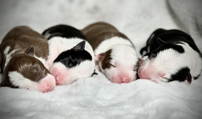 Our puppies include slate merle, lilac merle, blue merle, red merle, black, blue, lilac, red, white and blue, white and blue merle, white and red, white and red merle, white ticked, and slate. Colors will vary depending on the parent dogs.