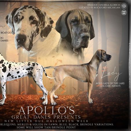 I'm Andrea A., the breeder behind Apollo's Great Danes (AGD's) located in Rockford, MI. We are proud to offer our beautiful Great Dane puppies to loving homes! Our dogs are healthy and have great temperaments. We are a small, in-home breeding program where we prioritize giving each dog and puppy the best care that we can. We cherish all of our animals and enjoy sharing the love of this breed with other individuals and families!