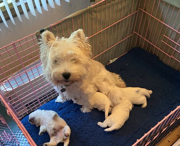 “this price includes guarantee, American Kennel Club (AKC) registration, initial vaccinations, deworming, socialization + collar + lead breaking. all potential new owner(s) are first evaluated on a home visit by one of older westies that own me + myself. all our westie puppies are sold for the same price [sex (dog or bitch), certified check required + health check by new owner(s)’s veterinarian].”