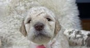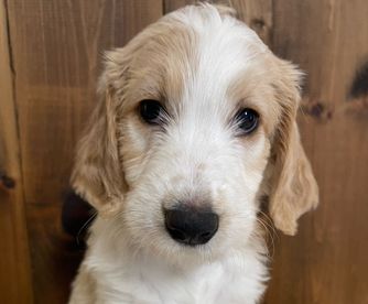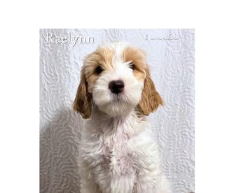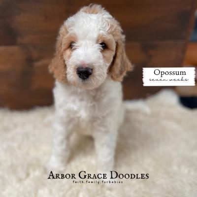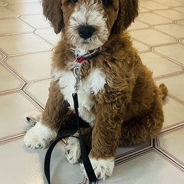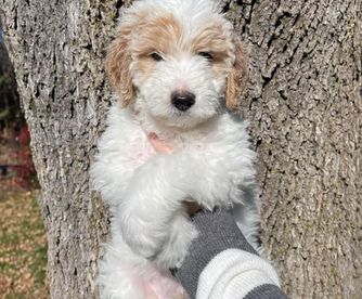 Sandy is a multi-generational parti goldendoodle with white and apricot markings. She has an incredibly sweet, gentle and calm disposition. Sandy is also genetically tested and clear.