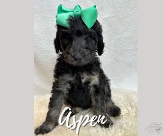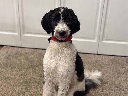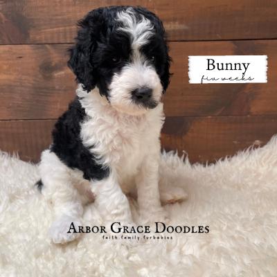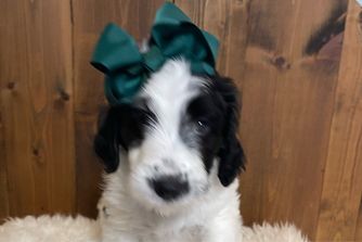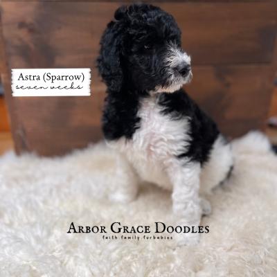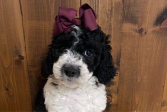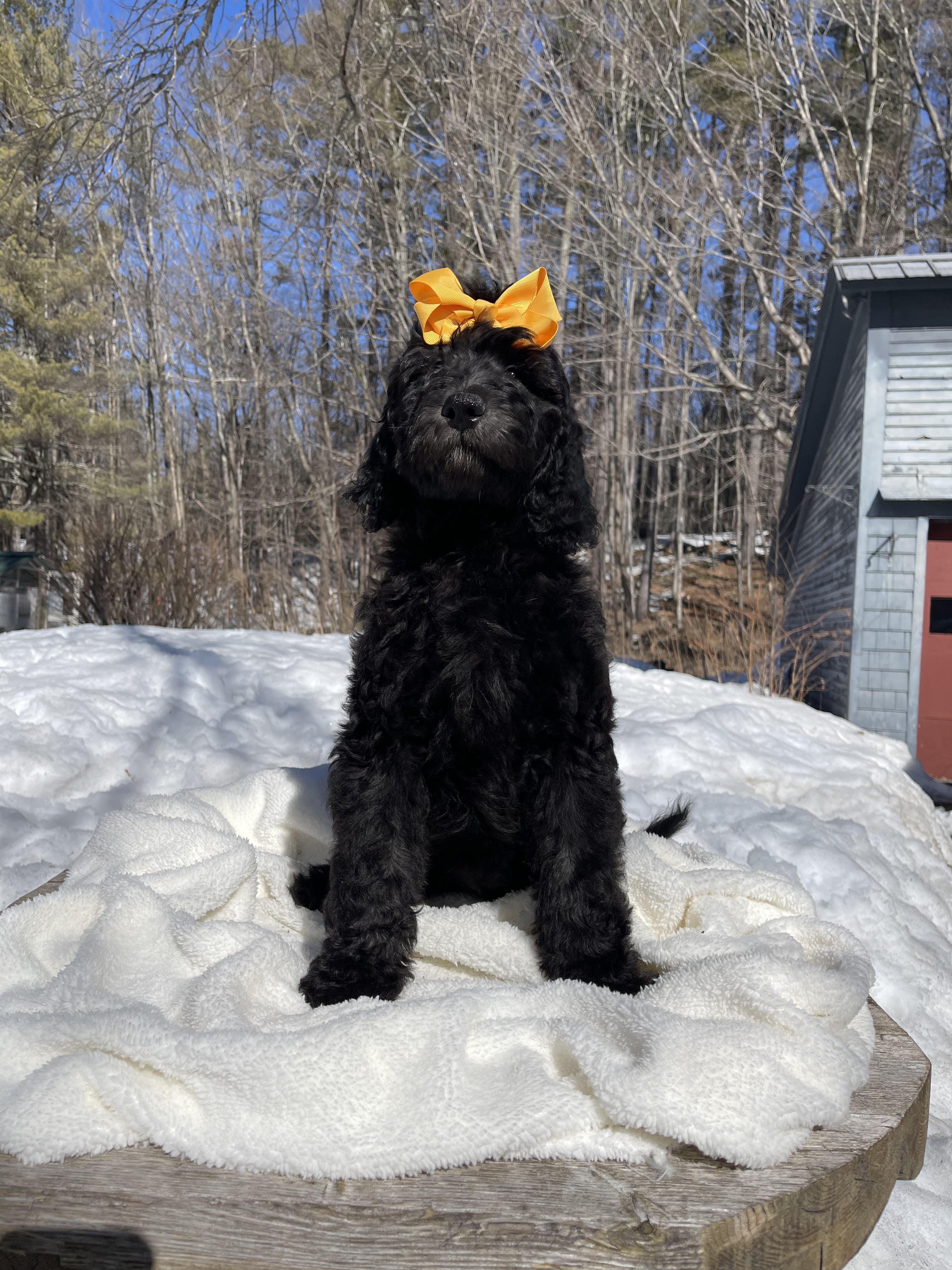 Roxie is a beautiful multi-generational Goldendoodle. She is a black and white Patti in color and weights 30 pounds. She has a sweet disposition and was specifically bred for a calm family friendly temperament. She is an also an amazing mama and first class cuddle bug!