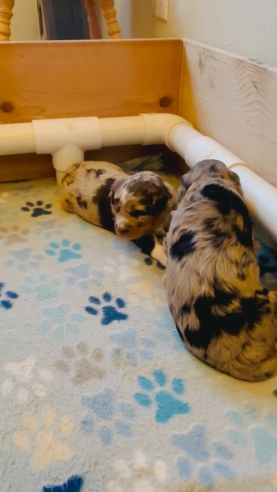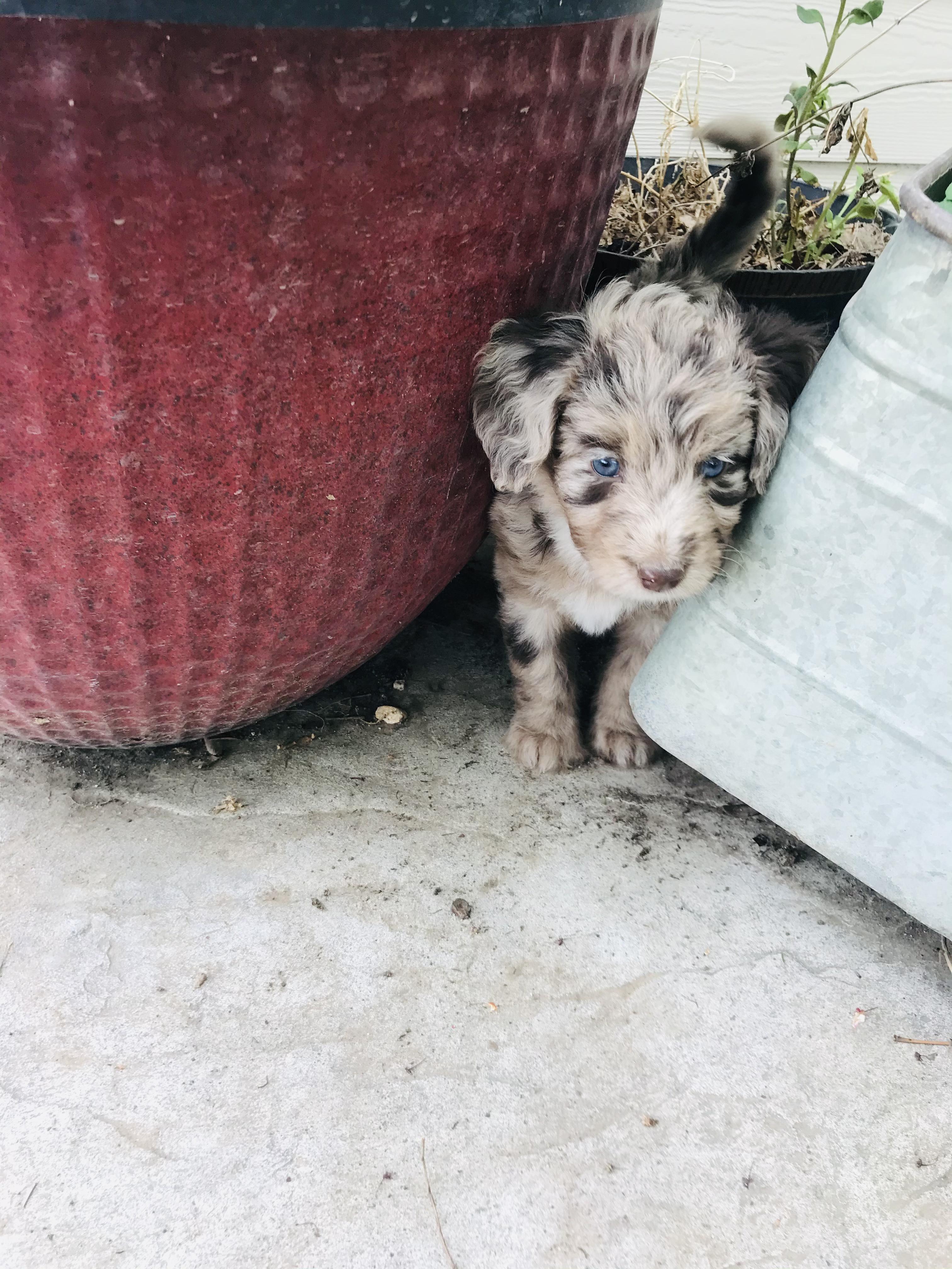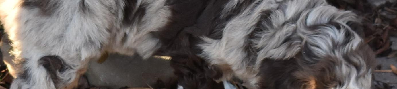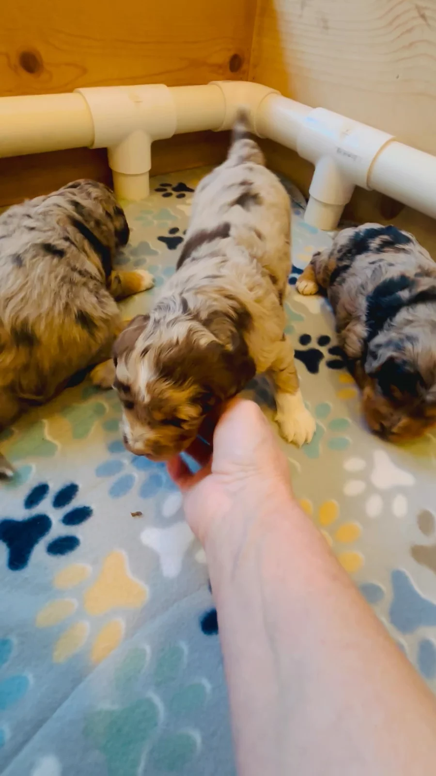 Our Australian Shepherd puppies include black & white, red merle, blue merle, black tri-color, and red tri-color. Aussiedoodle puppies include brown and white, blue merle, red merle, black and white, black tri-color, red phantom, and red tri-color. Colors will vary depending on the parent dogs.