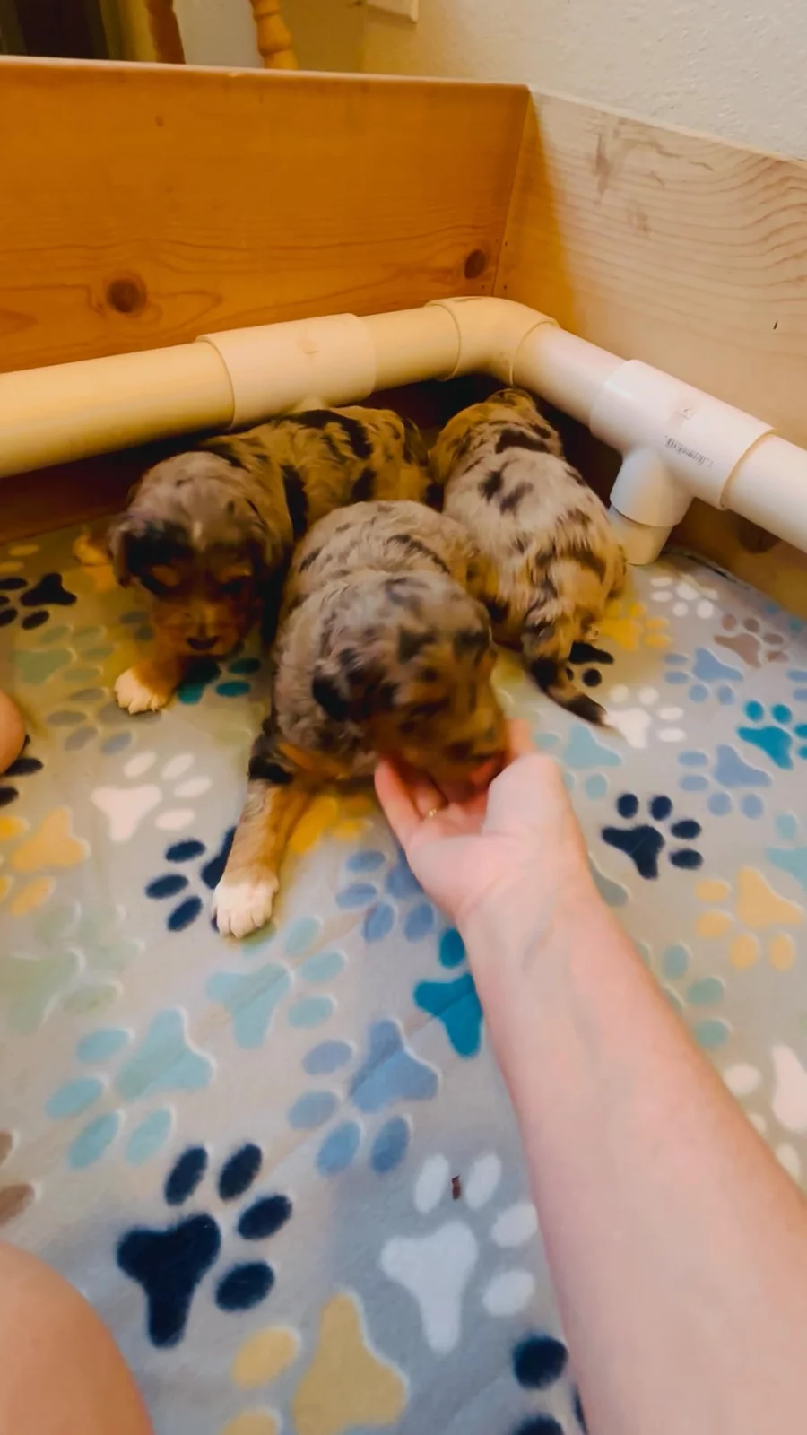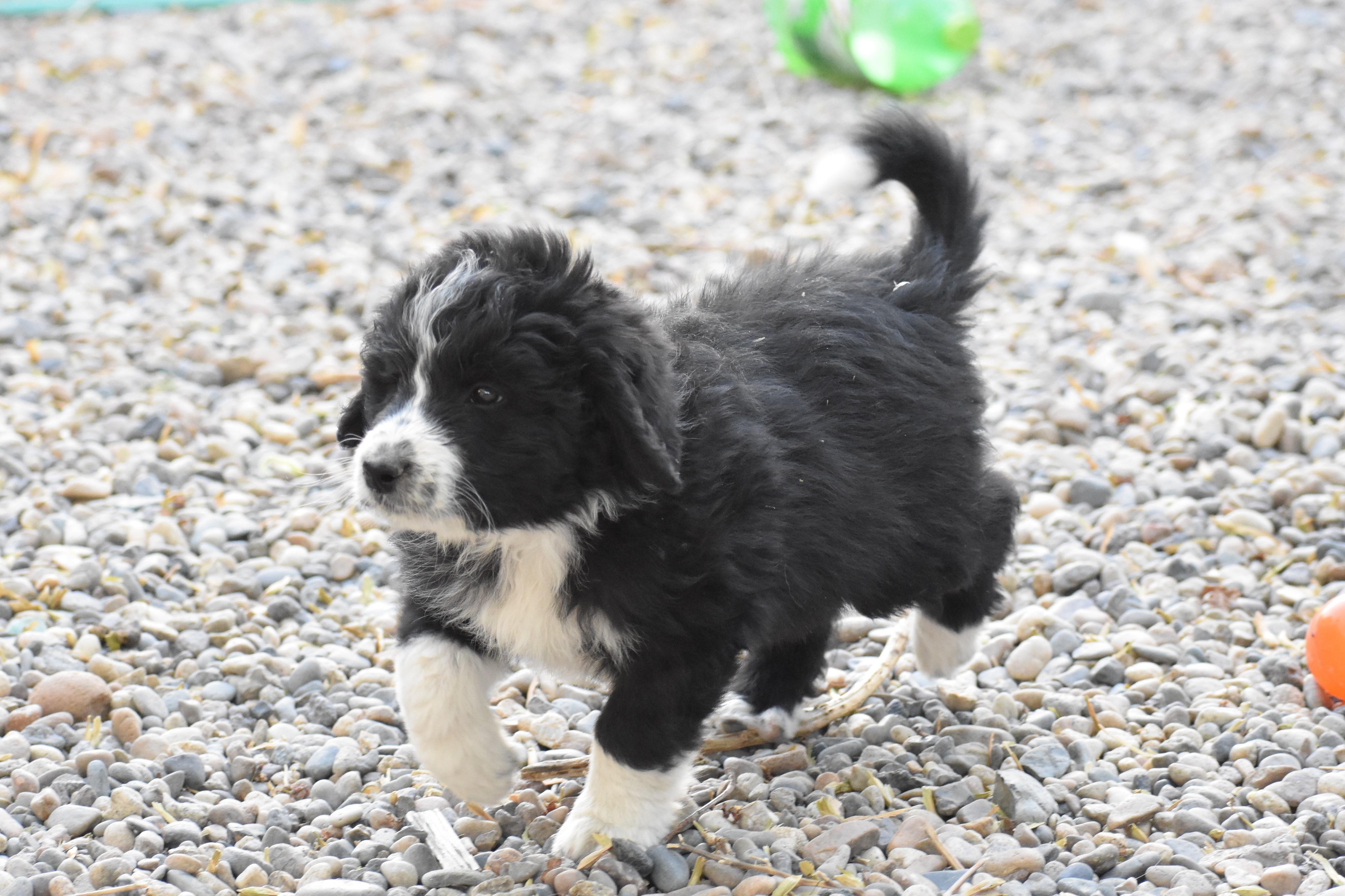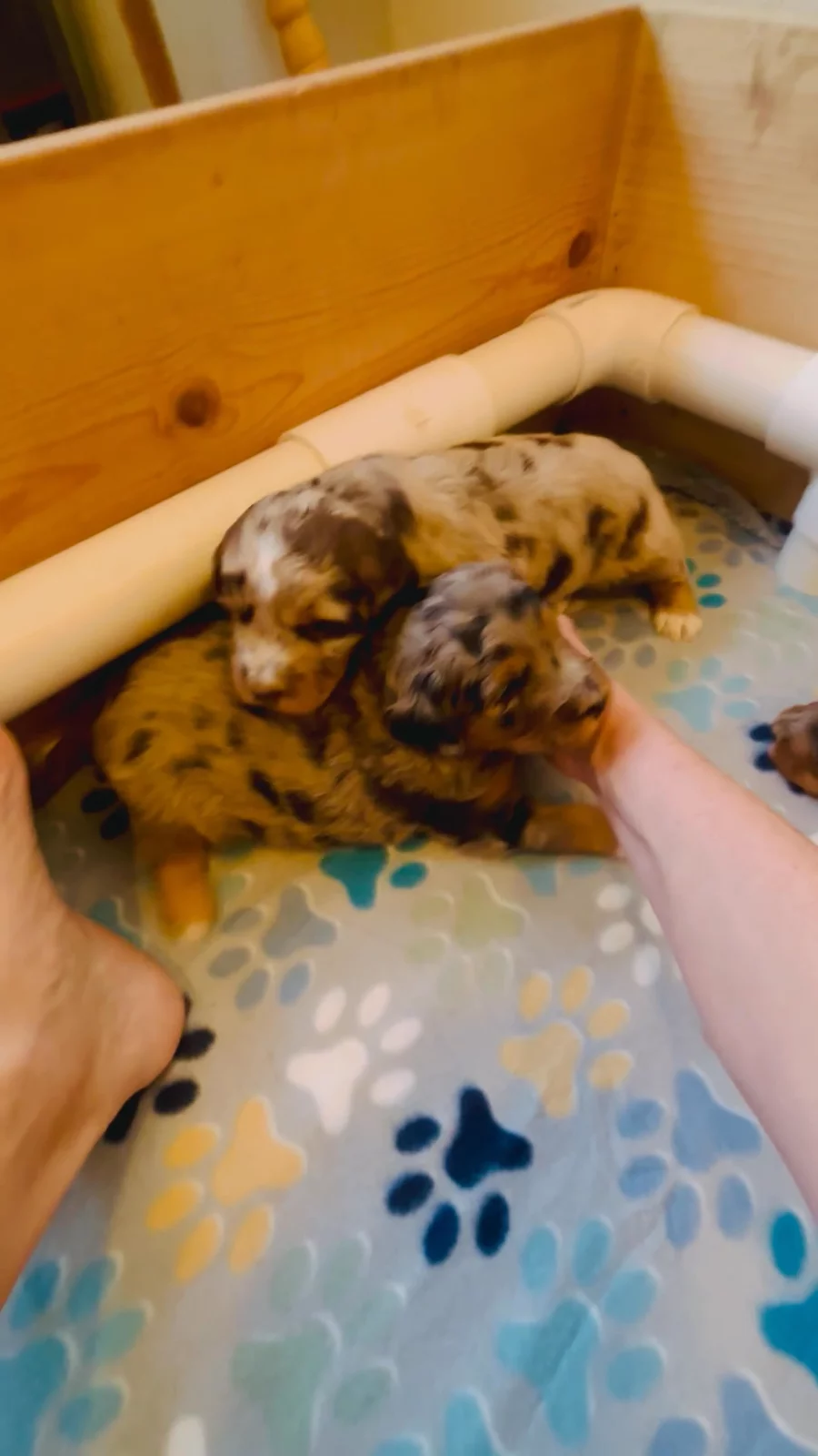 Our Australian Shepherd puppies include black & white, red merle, blue merle, black tri-color, and red tri-color. Aussiedoodle puppies include brown and white, blue merle, red merle, black and white, black tri-color, red phantom, and red tri-color. Colors will vary depending on the parent dogs.
