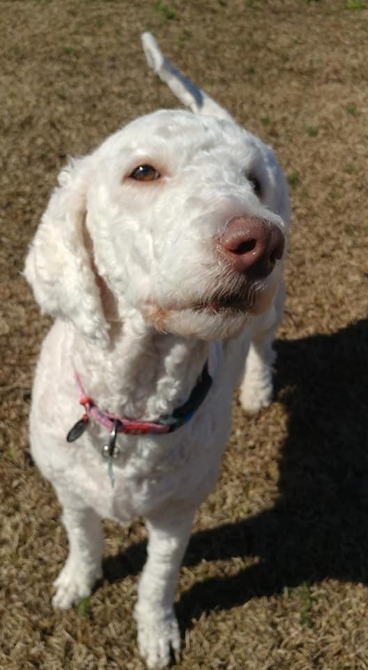Beautiful white labradoole. Wool coat. Intelligent, and patient. Wonderful with kids