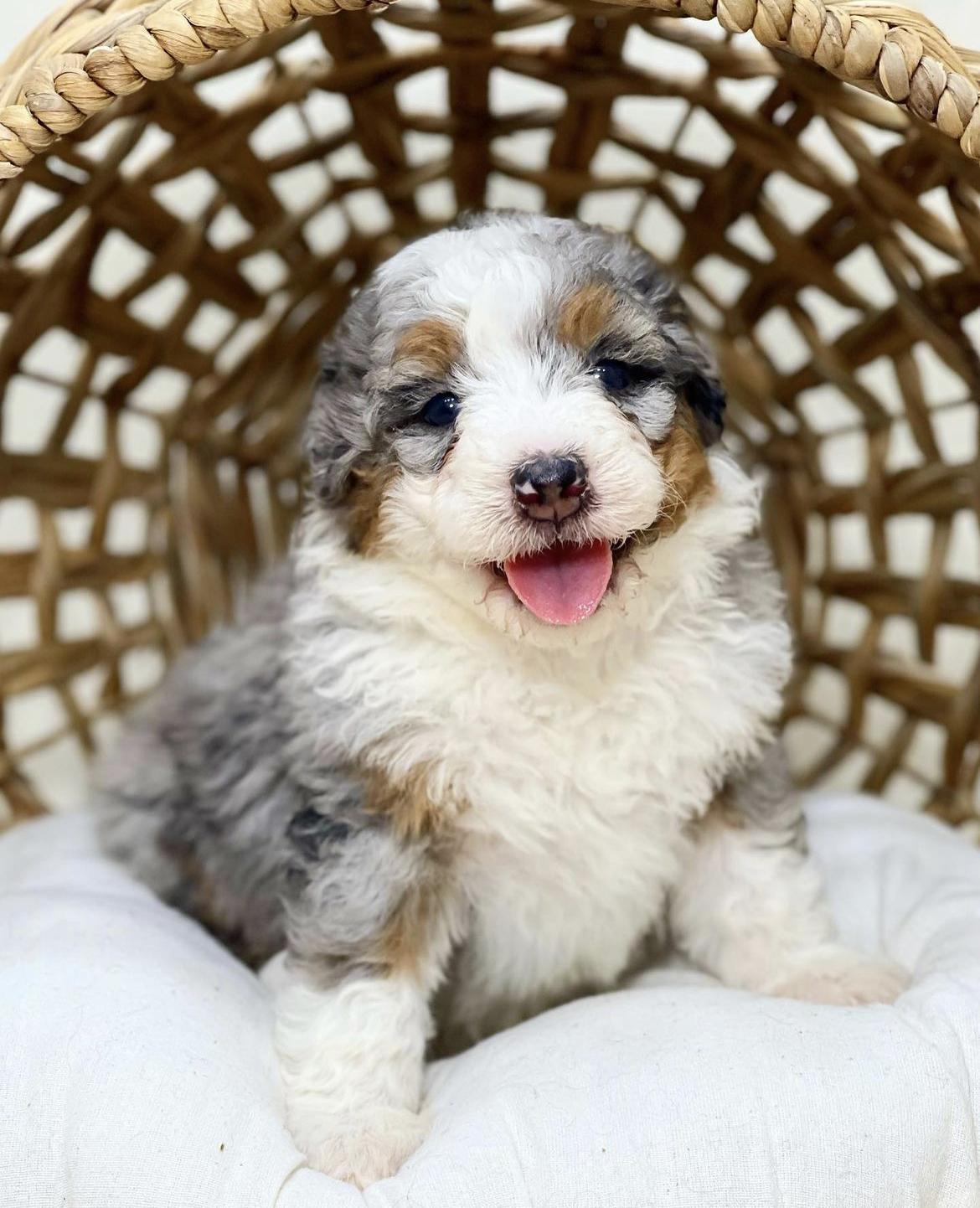 Rosie is our mini (30lbs) tricolored bernedoodle. She is the sweetest one. She is loving, cuddly, and compassionate, the ultimate emotional support companion.