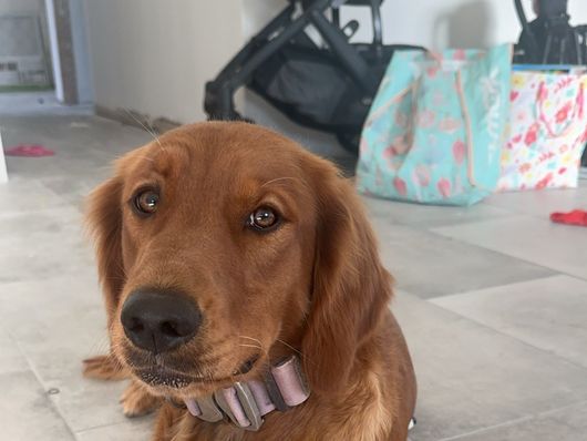 He is well behaved boy! He absolutely loves the water and swimming, he even swims in the summer. Like a typical golden he brings you gifts out of love. Such as socks, toys or anything soft like! He is a big gentle soul and great with kids.
