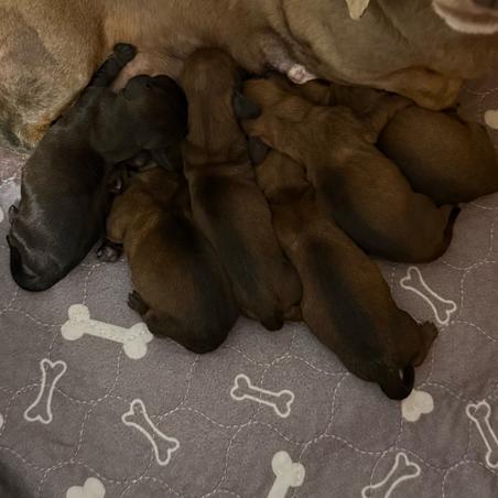 Puppies are doing AMAZING! Eating well and all are healthy! Kaninchen shaded reds and one brindle! 5 girls and 1 boy!