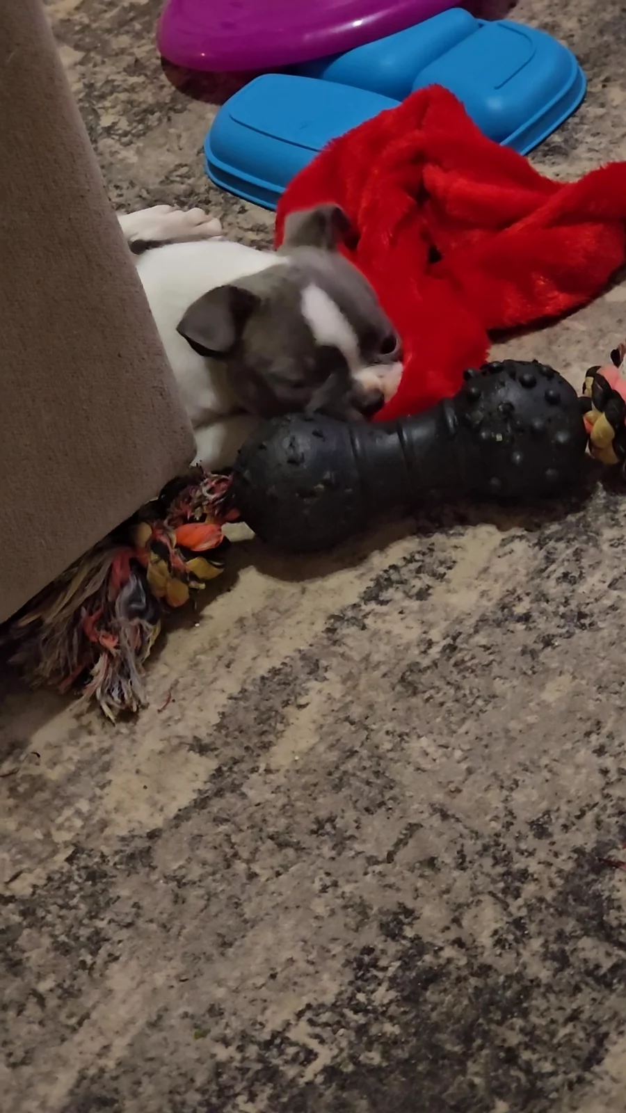 What a busy morning for the pups! Mrs. Purple was going to town on the red Santa hat toy, and Mr. Black was happily working on the rope after their hard little terrier play session. These two do not slow down 😂 thankfully the boy is a little more relaxed!