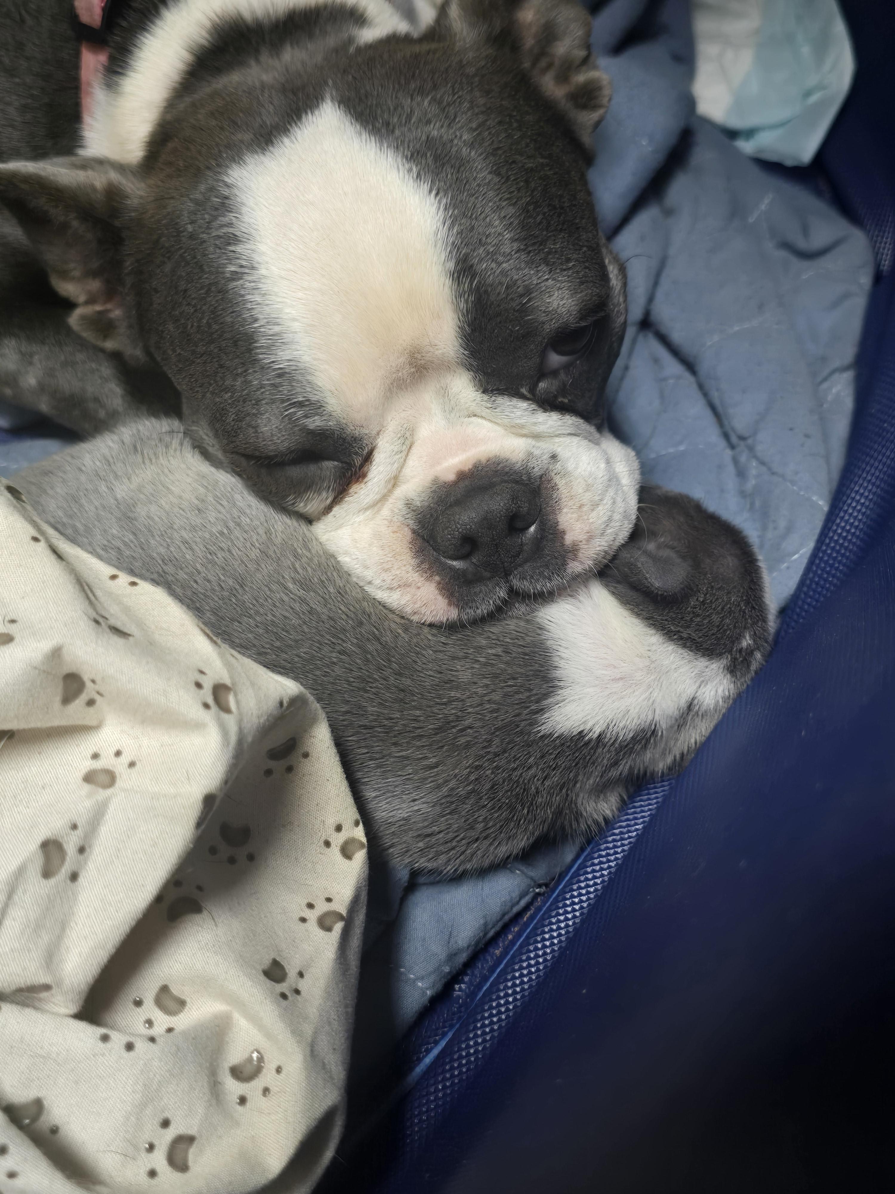 Playful but overall a relaxed Boston. He loves kids, loves snuggles (even if it’s just a foot!), and gets along wonderfully with other animals. A very gentle, loving companion.