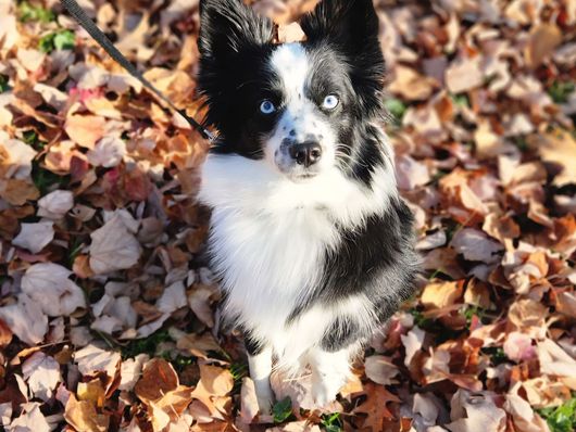 Adorable blue merle male with two blue eyes. Maverick lives in a guardian home and their four year old little girl is his best friend. He is super friendly and outgoing and we can't wait for his first litter of pups!