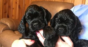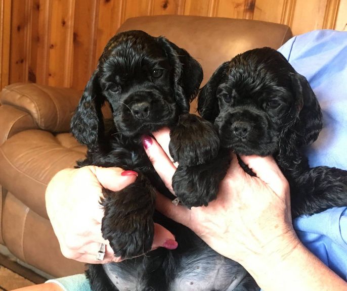 Our Irish Setter puppies are mahogany. Cocker Spaniel puppies include buff, black and tan, and black. Colors will vary depending on the parent dogs.