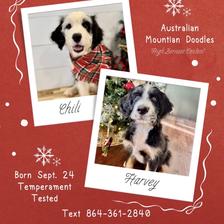 Our Assorted Doodle Crosses puppies include black tri-color and blue merle. Aussiedoodle puppies include blue merle, red merle, black phantom, black and white, and red phantom. Miniature Australian Shepherd puppies include blue merle, black tri, red tri, and red merle. Colors will vary depending on the parent dogs.