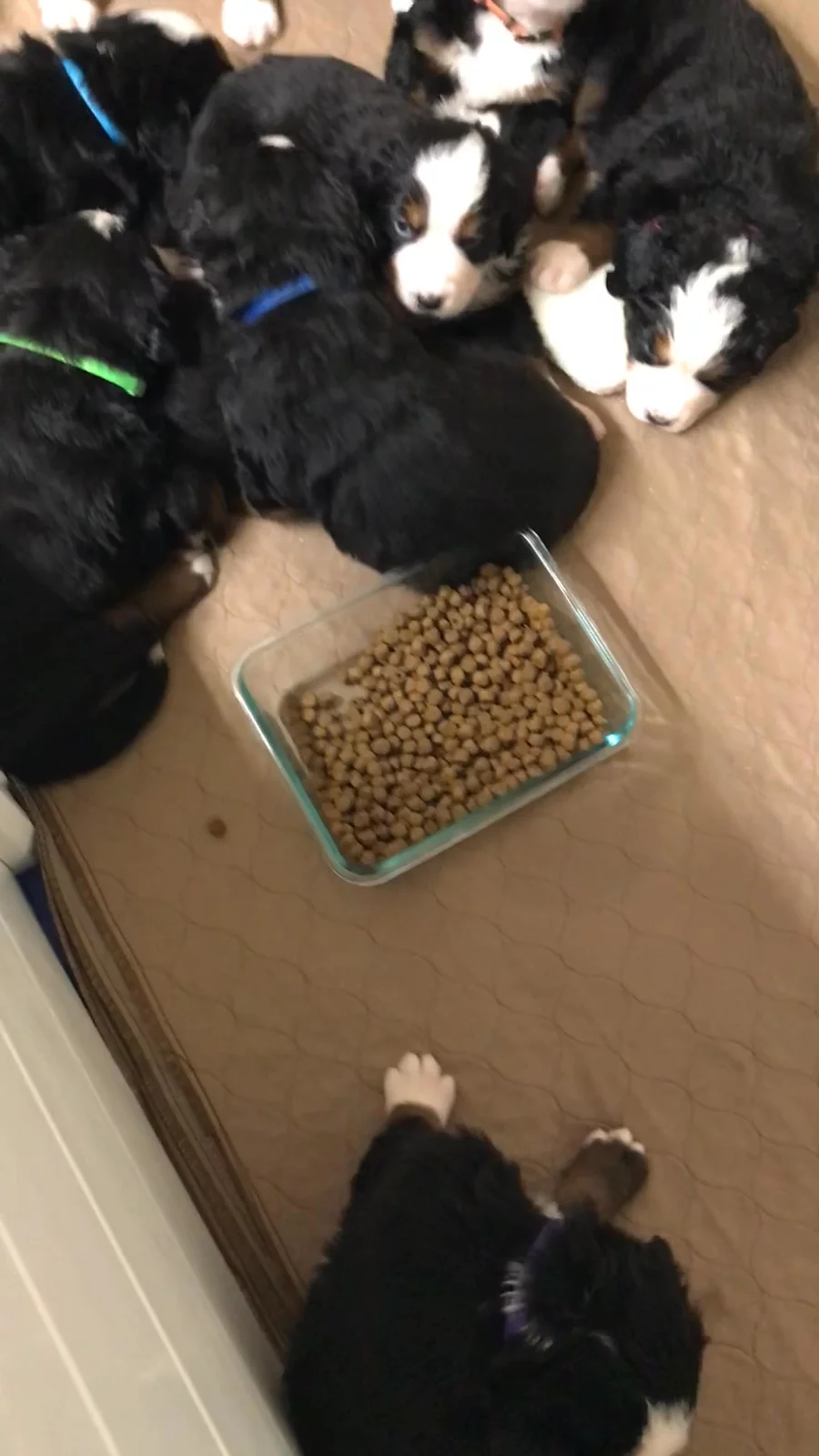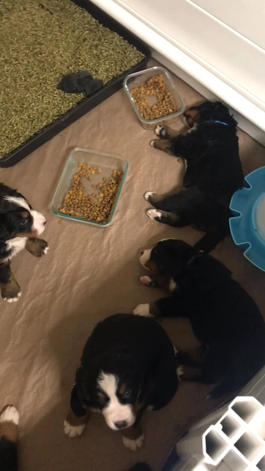 Our Bernedoodle puppies include tri-color and merle. Bernese Mountain Dog puppies are black rust and white. Colors will vary depending on the parent dogs.