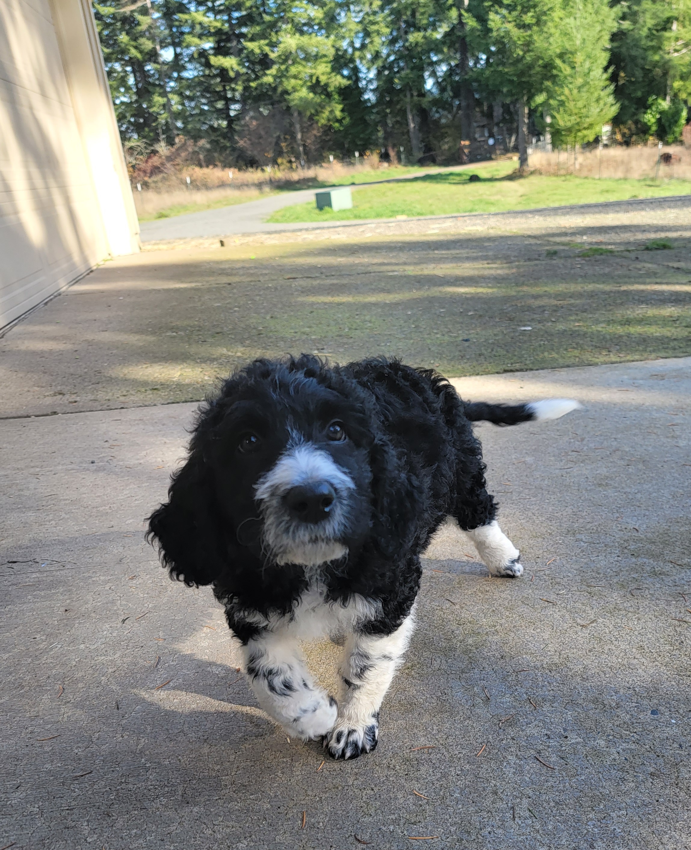 Tux is a 3 year old, small standard parti (or “tuxedo”) AKC poodle. He has sired several healthy litters of puppies. This is his 2nd litter with our dam, Rosie. They all have had wonderful personalities. Tux is known to be gentle and easy going. He gets along well with other dogs and is very athletic and active but has a great off switch. He is patient and attentive without being needy. He walks right by your side on a leash and makes great eye contact. He had a difficult first year of life due to an owner who didn’t have time for him, and left him outside in a kennel without meeting his socialization needs, so he can be shy at first. However, once he gets to know you, he warms right up and his personality is heartwarming. He is a very giving and considerate boy. He is my favorite dog I have ever owned.