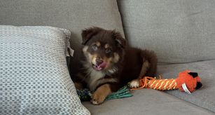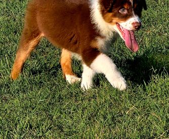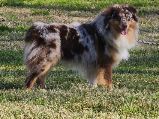 Toro is stunning and gets compliments everywhere we go. He is a red merle Miniature Australian Shepherd, 35lbs and is ASDR registered. This boy has a very thick show coat and has very good bone to him. We love his goofiness , loyalty to us and his affection. This boy is very food motivated and is medium drive.