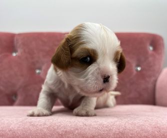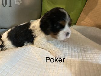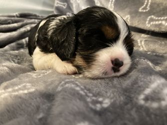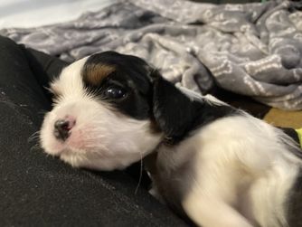 We fell in love with King Charles Cavaliers 14 years ago. I purchased a Cavalier and he died from a heart disorder. I knew nothing of them on my first go around. I was so upset when he passed, I did an extreme amount of research and located my female dog from a breeder that knew exactly what they were doing and verified the family lineage had bread the heart issues from the breed while ensuring the trait of no shedding while maintaining the true cavalier beauty and style. I’m hopeful these same traits will pass to each puppy of hers. Oh, yea did I mention how intelligent she is? Pixy watches TV and can decipher what object is on the TV screen. One last needs to know of Pixy, "Not to Brag" but she delivered 8 babies and she breast feeds 8 babies essentially that is equivalent to 2 litters at once without issue. Pixy is the poster child for healthy King Charles female dogs! We do guarantee that her puppies will be the healthy. All 7 of her puppies including 3 females and 4 males were born on February 23rd of 2023.
