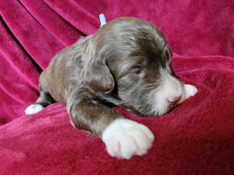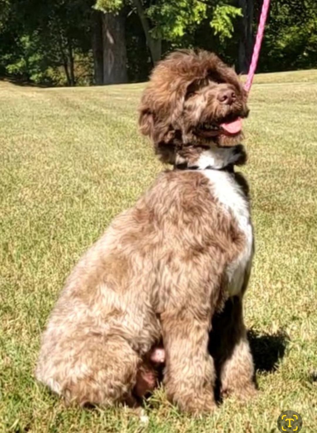 Bailey is a beautiful brown and white wavy coated Portuguese Water Dog. She is an excellent fetcher and will retrieve her tennis ball all day long. She loves swimming in the pool with the family, and romping in any available water source on hikes and walks. She loves kids and has been a wonderful family pet for our four small children. She enjoys playing tug and fetch but also is happy to chill on the couch. Bedtime stories for the children at night have always been her favorite family time, and every night you can find her on the sofa snuggled up between the kids to be petted during stories. Bailey takes excellent care of her puppies and is a lovely mother.