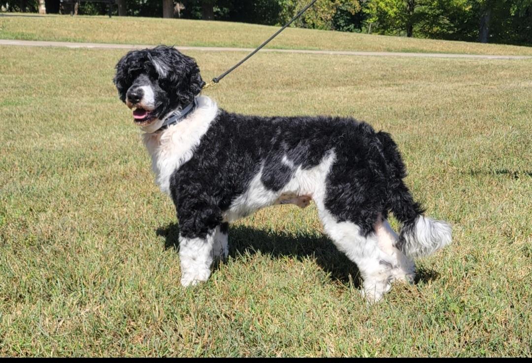 Kody is the most mellow Portuguese Water dog you will ever meet! We prize his temperament above all as PWDs in general are very high energy dogs and can be a bit much for most families. Kody loves to go for long walks and hikes, he enjoys playing tug and splashing in ponds and creeks. But he also loves to chill and cuddle on the couch. He brings balance to our program since most of our customers are looking for good family dogs that have the energy to go on adventures, but are also able to be calm and snuggly in the house without being a constant ball of energy. He has a low prey drive and mingles with our free ranging chickens and the family horses and goats without any trouble. He has excellent stocky conformation, a lovely coat and beautiful coloring. He is an wonderful family pet and has helped raise all four of our small children, letting them snuggle and crawl all over him even as babies. Kody really is the complete package!
