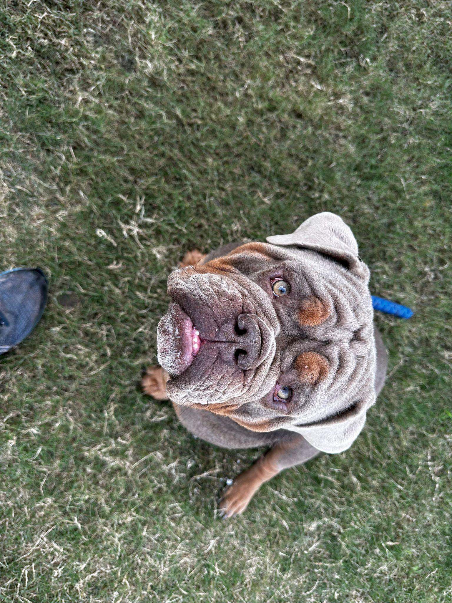 Darth is an AKC registered english bulldog, he is a tri-color fullsuit bulldog. I bred the litter when he was born and I decided to keep him. He is sweet and a loving bulldog. Very smart and easy to train. He has green eyes and is a handsome boy.
