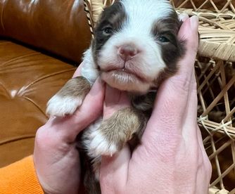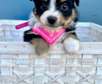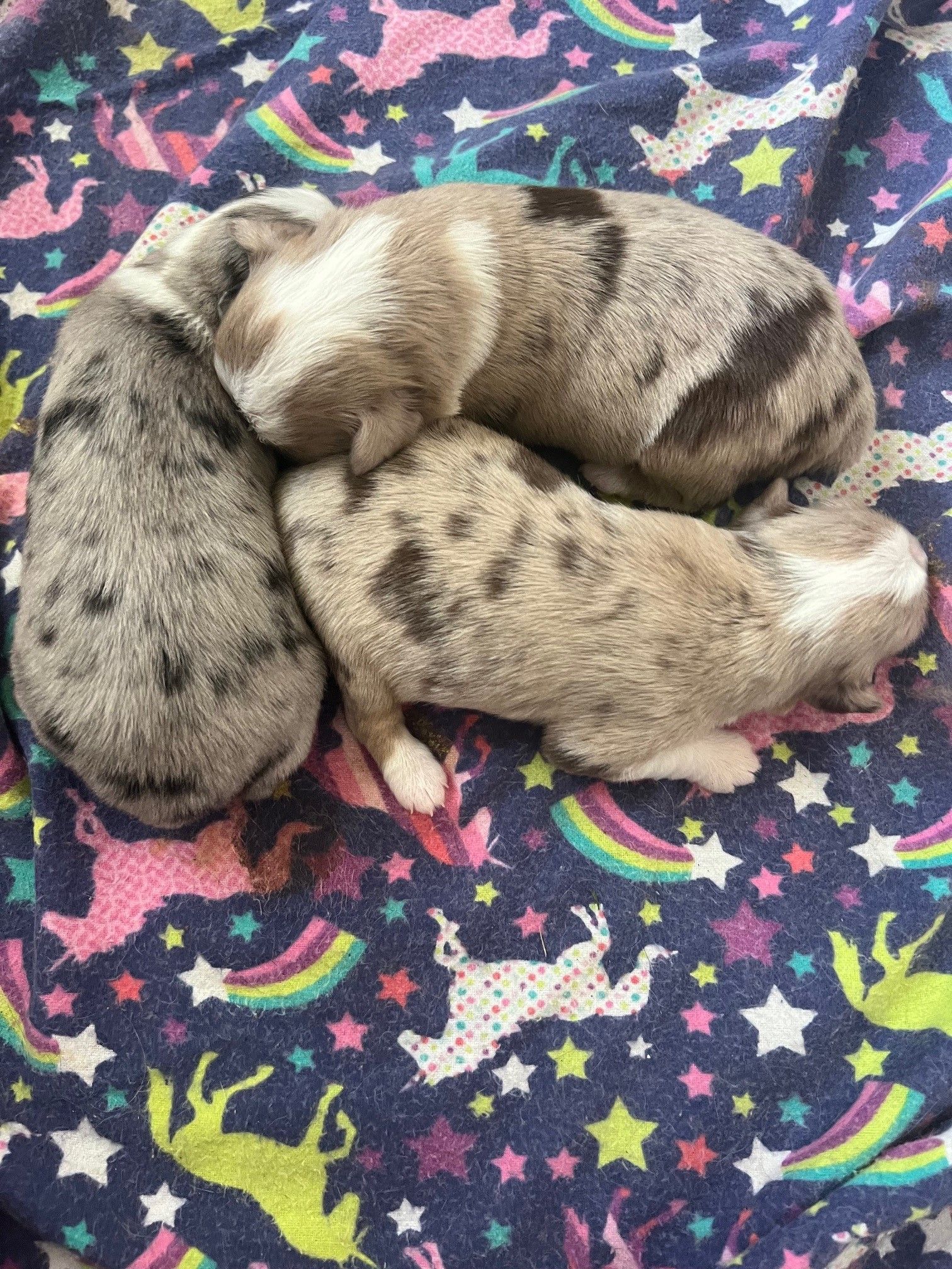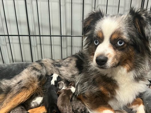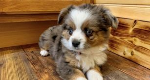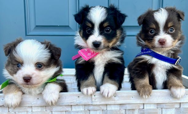 Our puppies include black tri, blue merle, red merle, and red tri. Colors will vary depending on the parent dogs.