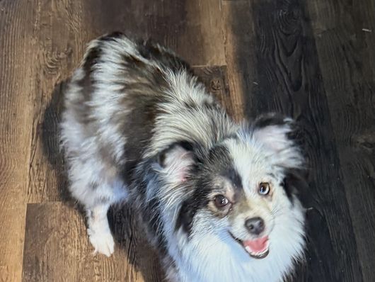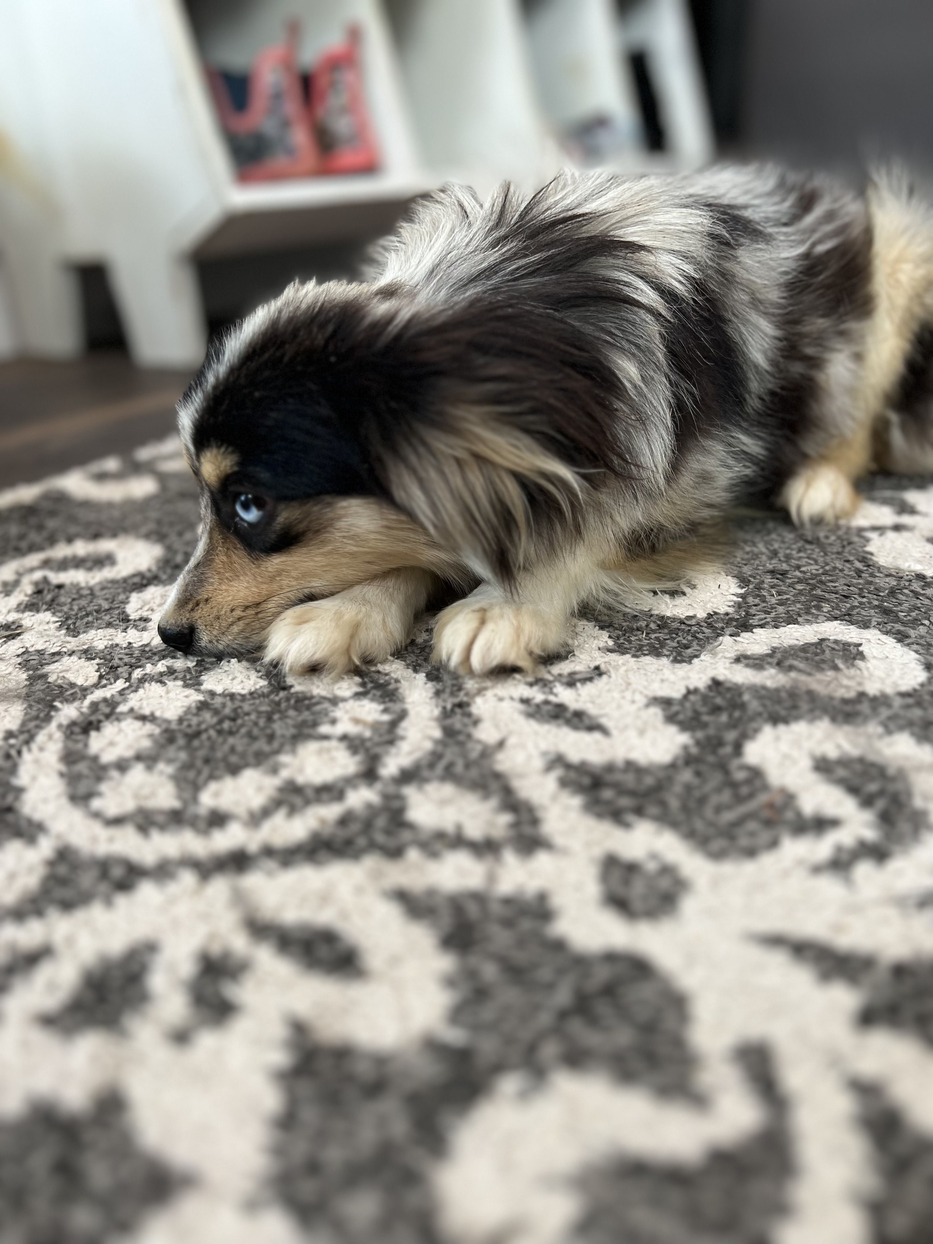 Fancy is a blue merle female she has striking blue eyes. As do all of her puppies.